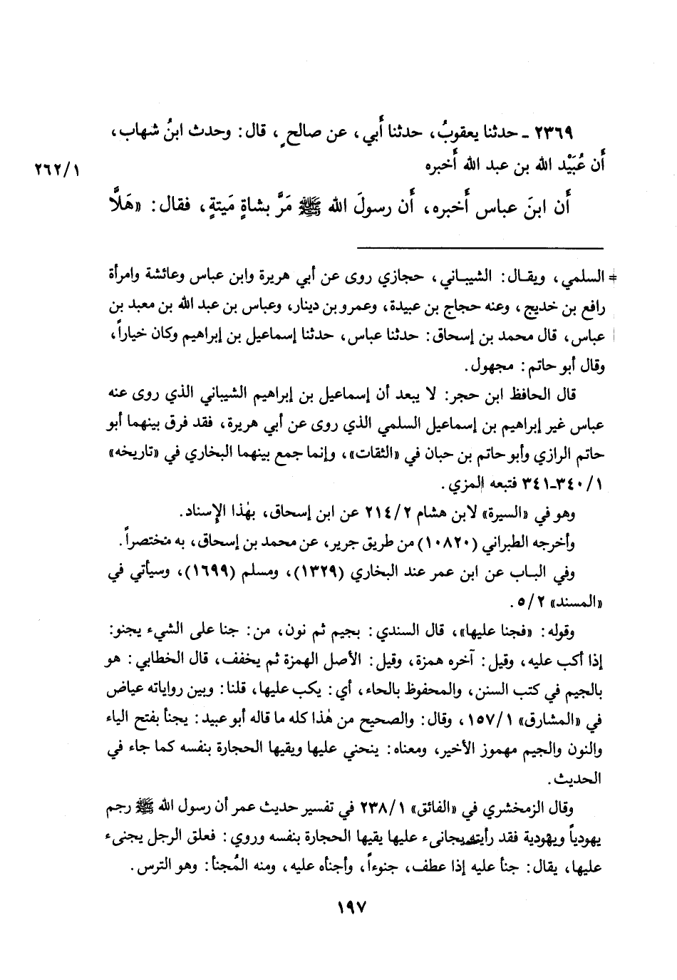 ٢٣٦٩ - حَدَّثَنَا يَعْقُوبُ، حَدَّثَنَا أَبِي، عَنْ صَالِحٍ، قَالَ: وَحَدَّثَ ابْنُ شِهَابٍ، أَنَّ عُبَيْدَ اللهِ بْنَ عَبْدِ اللهِ، أَخْبَرَهُ أَنَّ ابْنَ عَبَّاسٍ أَخْبَرَهُ، أَنَّ رَسُولَ اللهِ صَلَّى اللهُ عَلَيْهِ وَسَلَّمَ، مَرَّ بِشَاةٍ مَيْتَةٍ، فَقَالَ: " هَلا