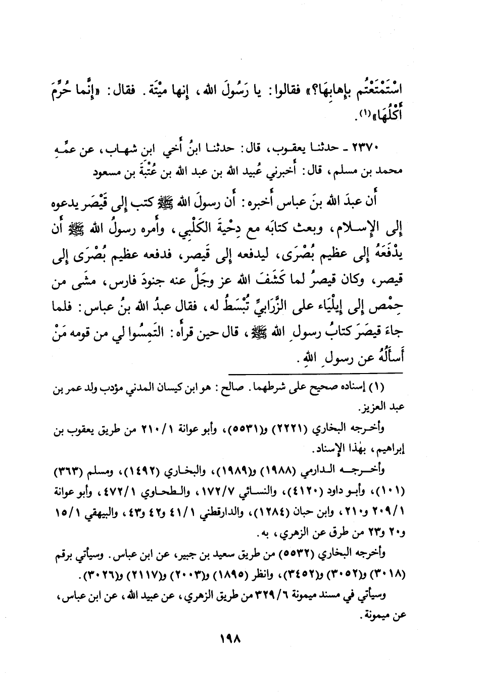 ٢٣٧٠ - حَدَّثَنَا يَعْقُوبُ، قَالَ: حَدَّثَنَا ابْنُ أَخِي ابْنِ شِهَابٍ، عَنْ عَمِّهِ مُحَمَّدِ بْنِ مُسْلِمٍ، قَالَ: أَخْبَرَنِي عُبَيْدُ اللهِ بْنُ عَبْدِ اللهِ بْنِ عُتْبَةَ بْنِ مَسْعُودٍ، أَنَّ عَبْدَ اللهِ بْنَ عَبَّاسٍ، أَخْبَرَهُ: أَنَّ رَسُولَ اللهِ صَلَّى اللهُ عَلَيْهِ وَسَلَّمَ كَتَبَ إِلَى قَيْصَرَ يَدْعُوهُ إِلَى الْإِسْلامِ، وَبَعَثَ كِتَابَهُ مَعَ دِحْيَةَ الْكَلْبِيِّ، وَأَمَرَهُ رَسُولُ اللهِ صَلَّى اللهُ عَلَيْهِ وَسَلَّمَ، أَنْ يَدْفَعَهُ إِلَى عَظِيمِ بُصْرَى، لِيَدْفَعَهُ إِلَى قَيْصَرَ، فَدَفَعَهُ عَظِيمُ بُصْرَى إِلَى قَيْصَرَ وَكَانَ قَيْصَرُ، لَمَّا كَشَفَ اللهُ عَزَّ وَجَلَّ عَنْهُ جُنُودَ فَارِسَ مَشَى مِنْ حِمْصَ إِلَى إِيلْيَاءَ عَلَى الزَّرَابِيِّ تُبْسَطُ لَهُ، فَقَالَ عَبْدُ اللهِ بْنُ عَبَّاسٍ: فَلَمَّا جَاءَ قَيْصَرَ كِتَابُ رَسُولِ اللهِ صَلَّى اللهُ عَلَيْهِ وَسَلَّمَ، قَالَ حِينَ قَرَأَهُ: الْتَمِسُوا لِي مِنْ قَوْمِهِ مَنْ أَسْأَلُهُ عَنْ رَسُولِ اللهِ،