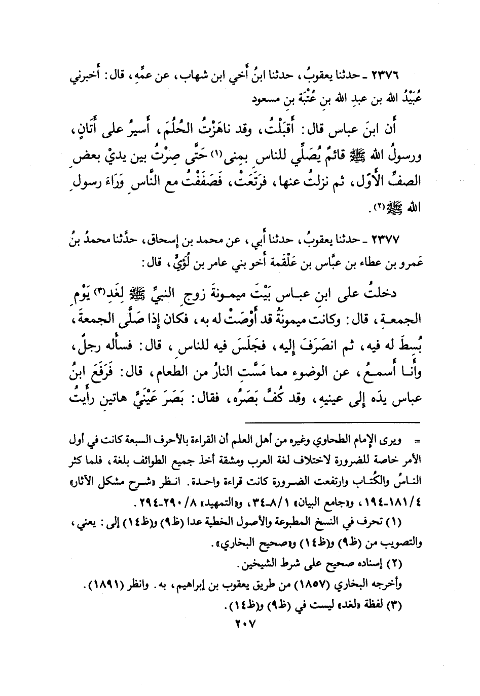 ٢٣٧٦ - حَدَّثَنَا يَعْقُوبُ، حَدَّثَنَا ابْنُ أَخِي ابْنِ شِهَابٍ، عَنْ عَمِّهِ، قَالَ: أَخْبَرَنِي عُبَيْدُ اللهِ بْنُ عَبْدِ اللهِ بْنِ عُتْبَةَ بْنِ مَسْعُودٍ، أَنَّ ابْنَ عَبَّاسٍ، قَالَ: أَقْبَلْتُ، وَقَدْ نَاهَزْتُ الْحُلُمَ، أَسِيرُ عَلَى أَتَانٍ، " وَرَسُولُ اللهِ صَلَّى اللهُ عَلَيْهِ وَسَلَّمَ، قَائِمٌ يُصَلِّي لِلنَّاسِ بِمِنًي (١) حَتَّى صِرْتُ بَيْنَ يَدَيْ بَعْضِ الصَّفِّ الْأَوَّلِ، ثُمَّ نَزَلْتُ عَنْهَا، فَرَتَعَتْ، فَصَفَفْتُ مَعَ النَّاسِ وَرَاءَ رَسُولِ اللهِ صَلَّى اللهُ عَلَيْهِ وَسَلَّمَ " (٢)