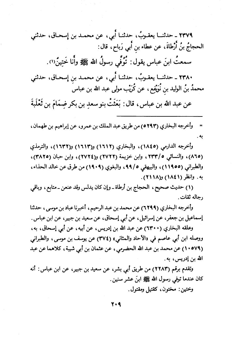 ٢٣٧٩ - حَدَّثَنَا يَعْقُوبُ، حَدَّثَنَا أَبِي، عَنِ مُحَمَّدِ بْنِ إِسْحَاقَ، حَدَّثَنِي الْحَجَّاجُ بْنُ أَرْطَاةَ، عَنْ عَطَاءِ بْنِ أَبِي رَبَاحٍ، قَالَ: سَمِعْتُ ابْنَ عَبَّاسٍ، يَقُولُ: " تُوُفِّيَ رَسُولُ اللهِ صَلَّى اللهُ عَلَيْهِ وَسَلَّمَ، وَأَنَا خَتِينٌ " (١)