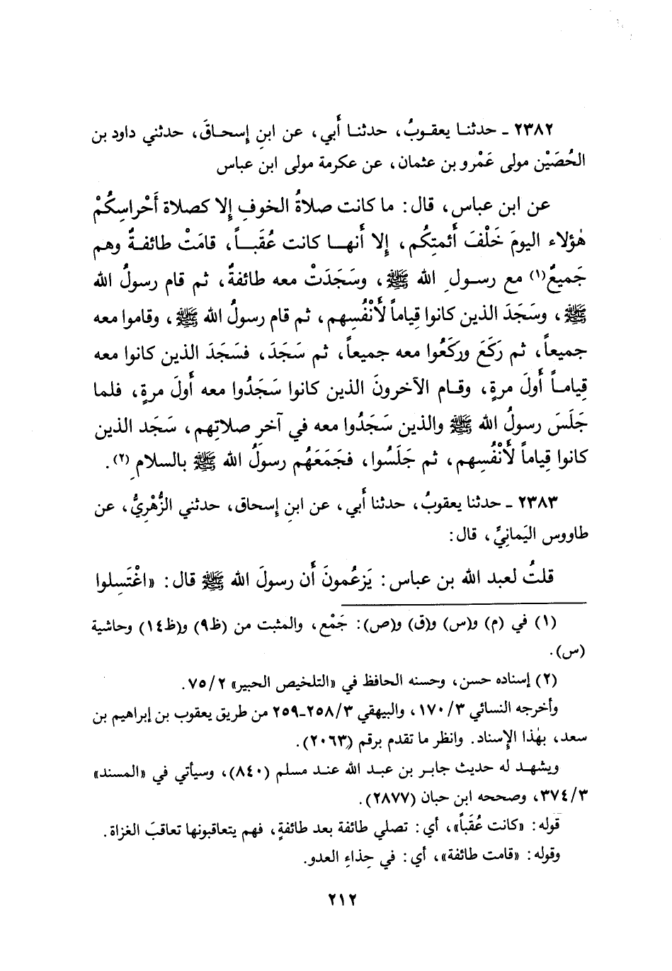 ٢٣٨٢ - حَدَّثَنَا يَعْقُوبُ، حَدَّثَنَا أَبِي، عَنِ ابْنِ إِسْحَاقَ، حَدَّثَنِي دَاوُدُ بْنُ الْحُصَيْنِ، مَوْلَى عَمْرِو بْنِ عُثْمَانَ، عَنْ عِكْرِمَةَ، مَوْلَى ابْنِ عَبَّاسٍ، عَنِ ابْنِ عَبَّاسٍ، قَالَ: " مَا كَانَتْ صَلَاةُ الْخَوْفِ إِلَّا كَصَلَاةِ أَحْرَاسِكُمْ هَؤُلَاءِ الْيَوْمَ خَلْفَ أَئِمَّتِكُمْ، إِلَّا أَنَّهَا كَانَتْ عُقْبًا، قَامَتْ طَائِفَةٌ وَهُمْ جَمِيعٌ (١) مَعَ رَسُولِ اللهِ صَلَّى اللهُ عَلَيْهِ وَسَلَّمَ، وَسَجَدَتْ مَعَهُ طَائِفَةٌ، ثُمَّ قَامَ رَسُولُ اللهِ صَلَّى اللهُ عَلَيْهِ وَسَلَّمَ، وَسَجَدَ الَّذِينَ كَانُوا قِيَامًا لِأَنْفُسِهِمْ، ثُمَّ قَامَ رَسُولُ اللهِ صَلَّى اللهُ عَلَيْهِ وَسَلَّمَ، وَقَامُوا مَعَهُ جَمِيعًا، ثُمَّ رَكَعَ وَرَكَعُوا مَعَهُ جَمِيعًا، ثُمَّ سَجَدَ، فَسَجَدَ الَّذِينَ كَانُوا مَعَهُ قِيَامًا أَوَّلَ مَرَّةٍ، وَقَامَ الْآخَرُونَ الَّذِينَ كَانُوا سَجَدُوا مَعَهُ أَوَّلَ مَرَّةٍ، فَلَمَّا جَلَسَ رَسُولُ اللهِ صَلَّى اللهُ عَلَيْهِ وَسَلَّمَ، وَالَّذِينَ سَجَدُوا مَعَهُ فِي آخِرِ صَلاتِهِمْ، سَجَدَ الَّذِينَ كَانُوا قِيَامًا لِأَنْفُسِهِمْ، ثُمَّ جَلَسُوا، فَجَمَعَهُمْ رَسُولُ اللهِ صَلَّى اللهُ عَلَيْهِ وَسَلَّمَ، بِالسَّلامِ " (٢)