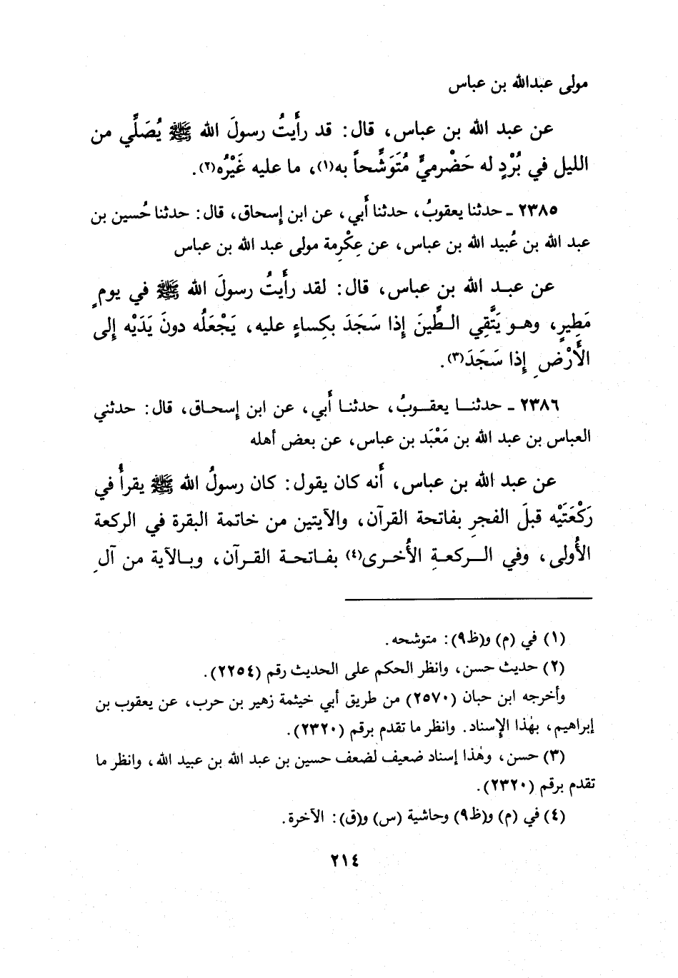٢٣٨٥ - حَدَّثَنَا يَعْقُوبُ، حَدَّثَنَا أَبِي، عَنِ ابْنِ إِسْحَاقَ، قَالَ: حَدَّثَنَا حُسَيْنُ بْنُ عَبْدِ اللهِ بْنِ عُبَيْدِ اللهِ بْنِ عَبَّاسٍ، عَنْ عِكْرِمَةَ، مَوْلَى عَبْدِ اللهِ بْنِ عَبَّاسٍ، عَنْ عَبْدِ اللهِ بْنِ عَبَّاسٍ، قَالَ: " لَقَدْ رَأَيْتُ رَسُولَ اللهِ صَلَّى اللهُ عَلَيْهِ وَسَلَّمَ، فِي يَوْمٍ مَطِيرٍ، وَهُوَ يَتَّقِي الطِّينَ إِذَا سَجَدَ بِكِسَاءٍ عَلَيْهِ يَجْعَلُهُ دُونَ يَدَيْهِ إِلَى الْأَرْضِ إِذَا سَجَدَ " (٣)