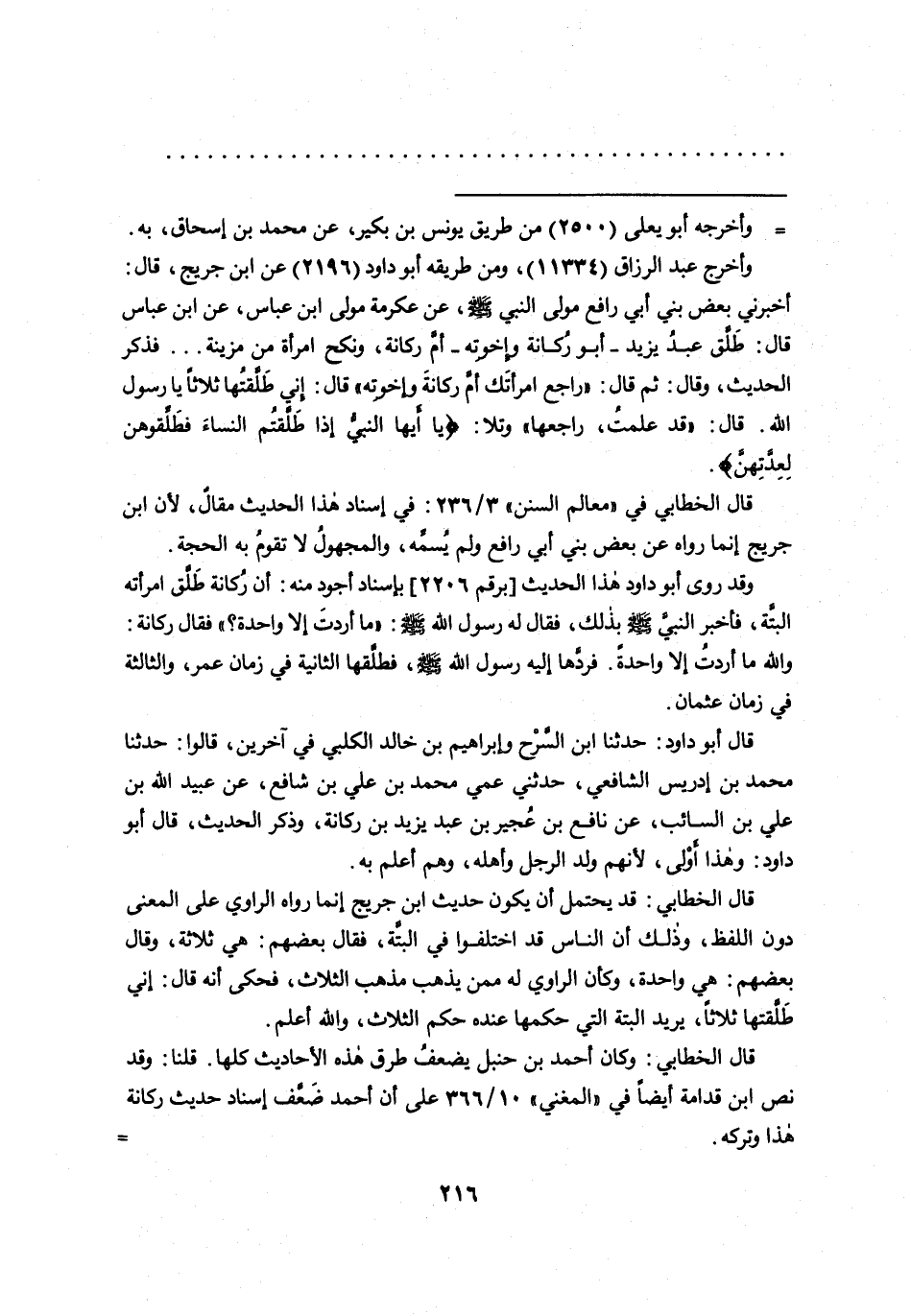 وقد روى أبو داود هذا الحديث [برقم ٢٢٠٦] بإسناد أجود منه: أن رُكانة طَلق امرأته البتة، فأخبر النبى صَلَّى اللهُ عَلَيْهِ وَسَلَّمَ بذلك، فقال له رسول الله صَلَّى اللهُ عَلَيْهِ وَسَلَّمَ: "ما أردتَ إلا واحدة؟ " فقال ركانة: والله ما أردتُ إلا واحدةً. فردها إليه رسول الله صَلَّى اللهُ عَلَيْهِ وَسَلَّمَ، فطلقها الثانية في زمان عمر، والثالثة في زمان عثمان.