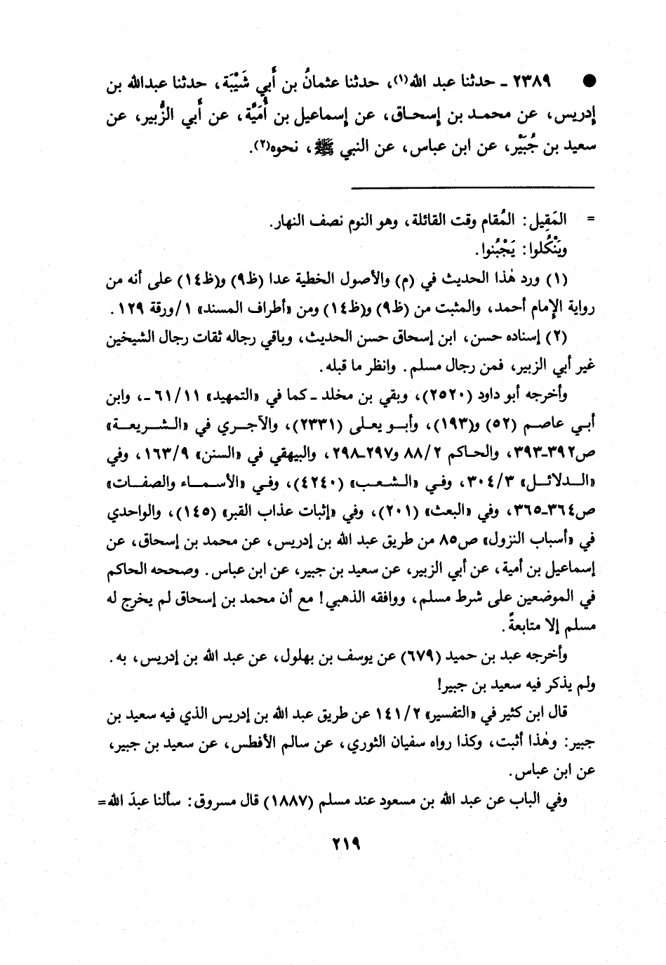 • ٢٣٨٩ - حَدَّثَنَا عَبْدُ اللهِ، (١) حَدَّثَنَا عُثْمَانُ بْنُ أَبِي شَيْبَةَ، حَدَّثَنَا عَبْدُ اللهِ بْنُ إِدْرِيسَ، عَنْ مُحَمَّدِ بْنِ إِسْحَاقَ، عَنْ إِسْمَاعِيلَ بْنِ أُمَيَّةَ، عَنْ أَبِي الزُّبَيْرِ، عَنْ سَعِيدِ بْنِ جُبَيْرٍ، عَنِ ابْنِ عَبَّاسٍ، عَنِ النَّبِيِّ صَلَّى اللهُ عَلَيْهِ وَسَلَّمَ، نَحْوَهُ (٢)