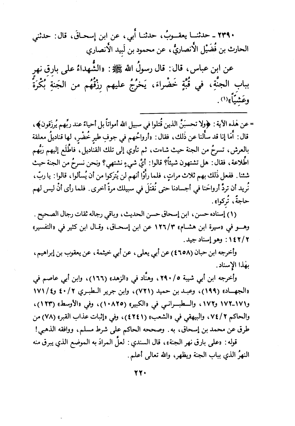 ٢٣٩٠ - حَدَّثَنَا يَعْقُوبُ، حَدَّثَنَا أَبِي، عَنِ ابْنِ إِسْحَاقَ، قَالَ: حَدَّثَنِي الْحَارِثُ بْنُ فُضَيْلٍ الْأَنْصَارِيُّ، عَنْ مَحْمُودِ بْنِ لَبِيدٍ الْأَنْصَارِيِّ، عَنِ ابْنِ عَبَّاسٍ، قَالَ: قَالَ رَسُولُ اللهِ صَلَّى اللهُ عَلَيْهِ وَسَلَّمَ: " الشُّهَدَاءُ عَلَى بَارِقٍ - نَهْرٍ بِبَابِ الْجَنَّةِ - فِي قُبَّةٍ خَضْرَاءَ، يَخْرُجُ عَلَيْهِمْ رِزْقُهُمْ مِنَ الجَنَّةِ بُكْرَةً وَعَشِيًّا " (١)