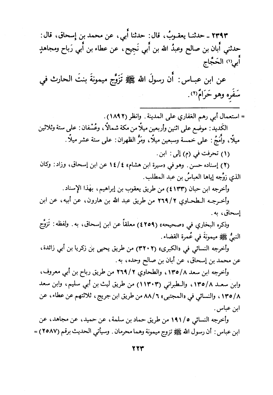٢٣٩٣ - حَدَّثَنَا يَعْقُوبُ، قَالَ: حَدَّثَنَا أَبِي، عَنْ مُحَمَّدِ بْنِ إِسْحَاقَ، قَالَ: حَدَّثَنِي أَبَانُ بْنُ صَالِحٍ، وَعَبْدُ اللهِ بْنُ أَبِي نَجِيجٍ، عَنْ عَطَاءِ بْنِ أَبِي رَبَاحٍ، وَمُجَاهِدٍ أَبِي (١) الْحَجَّاجِ، عَنِ ابْنِ عَبَّاسٍ: " أَنَّ رَسُولَ اللهِ صَلَّى اللهُ عَلَيْهِ وَسَلَّمَ، تَزَوَّجَ مَيْمُونَةَ بِنْتَ الْحَارِثِ فِي سَفَرِهِ وَهُوَ حَرَامٌ " (٢)