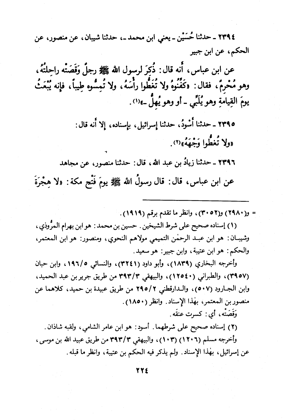 ٢٣٩٥ - " حَدَّثَنَا أَسْوَدُ، حَدَّثَنَا إِسْرَائِيلُ، بِإِسْنَادِهِ إِلا أَنَّهُ قَالَ: " وَلا تُغَطُّوا وَجْهَهُ " (٢)