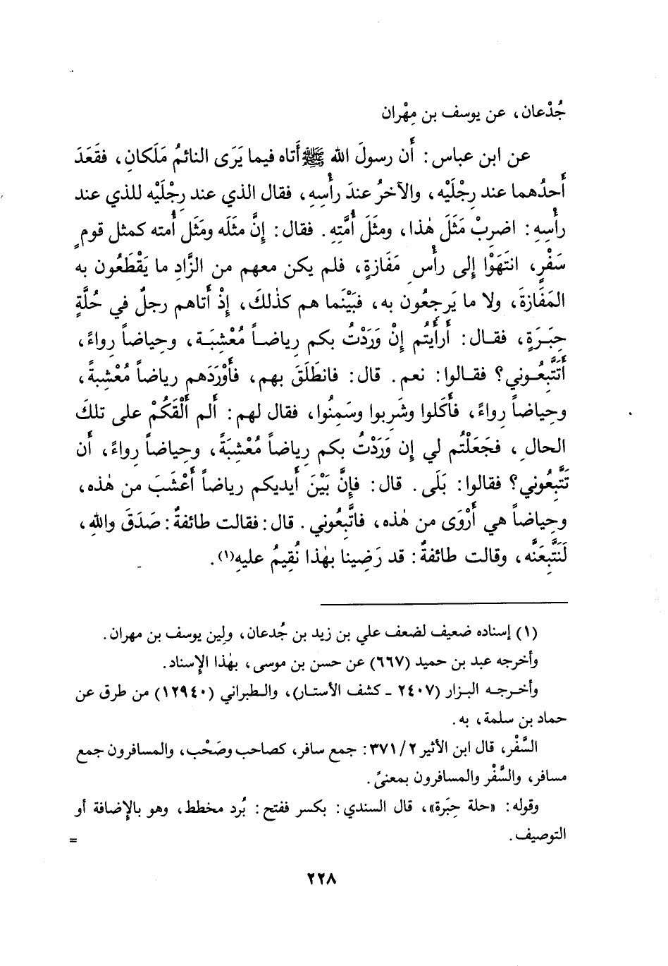 جُدْعَانَ، عَنْ يُوسُفَ بْنِ مِهْرَانَ، عَنِ ابْنِ عَبَّاسٍ: " أَنَّ رَسُولَ اللهِ صَلَّى اللهُ عَلَيْهِ وَسَلَّمَ أَتَاهُ فِيمَا يَرَى النَّائِمُ مَلَكَانِ، فَقَعَدَ أَحَدُهُمَا عِنْدَ رِجْلَيْهِ، وَالْآخَرُ عِنْدَ رَأْسِهِ، فَقَالَ الَّذِي عِنْدَ رِجْلَيْهِ لِلَّذِي عِنْدَ رَأْسِهِ: اضْرِبْ مَثَلَ هَذَا، وَمَثَلَ أُمَّتِهِ، فَقَالَ: إِنَّ مَثَلَهُ وَمَثَلَ أُمَّتِهِ كَمَثَلِ قَوْمٍ سَفْرٍ، انْتَهَوْا إِلَى رَأْسِ مَفَازَةٍ، فَلَمْ يَكُنْ مَعَهُمْ مِنَ الزَّادِ مَا يَقْطَعُونَ بِهِ الْمَفَازَةَ، وَلا مَا يَرْجِعُونَ بِهِ، فَبَيْنَمَا هُمْ كَذَلِكَ، إِذْ أَتَاهُمْ رَجُلٌ فِي حُلَّةٍ حِبَرَةٍ، فَقَالَ: أَرَأَيْتُمْ إِنْ وَرَدْتُ بِكُمْ رِيَاضًا مُعْشِبَةً، وَحِيَاضًا رُوَاءً، أَتَتَّبِعُونِي؟ فَقَالُوا: نَعَمْ، قَالَ: فَانْطَلَقَ بِهِمْ، فَأَوْرَدَهُمْ رِيَاضًا مُعْشِبَةً، وَحِيَاضًا رُوَاءً، فَأَكَلُوا وَشَرِبُوا وَسَمِنُوا، فَقَالَ لَهُمْ: أَلَمْ أَلْقَكُمْ عَلَى تِلْكَ الْحَالِ، فَجَعَلْتُمْ لِي إِنْ وَرَدْتُ بِكُمْ رِيَاضًا مُعْشِبَةً، وَحِيَاضًا رُوَاءً، أَنْ تَتَّبِعُونِي؟ فَقَالُوا: بَلَى، قَالَ: فَإِنَّ بَيْنَ أَيْدِيكُمْ رِيَاضًا أَعْشَبَ مِنْ هَذِهِ، وَحِيَاضًا هِيَ أَرْوَى مِنْ هَذِهِ، فَاتَّبِعُونِي، قَالَ: فَقَالَتْ طَائِفَةٌ: صَدَقَ وَاللهِ لَنَتَّبِعَنَّهُ، وَقَالَتْ طَائِفَةٌ: قَدْ رَضِينَا بِهَذَا نُقِيمُ عَلَيْهِ " (١)