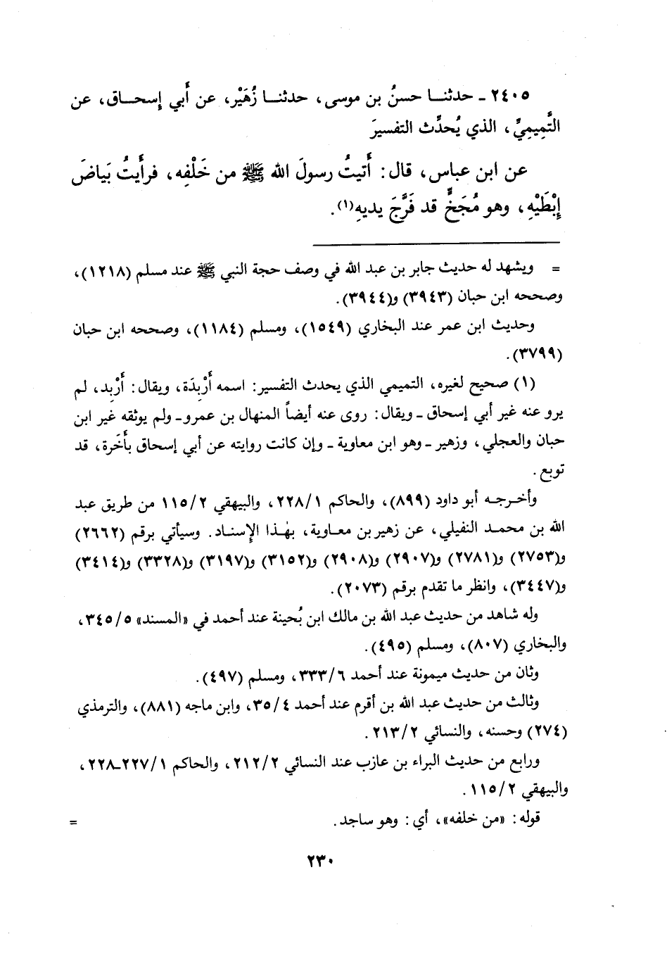٢٤٠٥ - حَدَّثَنَا حَسَنُ بْنُ مُوسَى، حَدَّثَنَا زُهَيْرٌ، عَنْ أَبِي إِسْحَاقَ، عَنِ التَّمِيمِيِّ، الَّذِي يُحْدِثُ التَّفْسِيرَ، عَنِ ابْنِ عَبَّاسٍ، قَالَ: " أَتَيْتُ رَسُولَ اللهِ صَلَّى اللهُ عَلَيْهِ وَسَلَّمَ مِنْ خَلْفِهِ، فَرَأَيْتُ بَيَاضَ إِبْطَيْهِ، وَهُوَ مُجَخٍّ قَدْ فَرَّجَ يَدَيْهِ " (١)