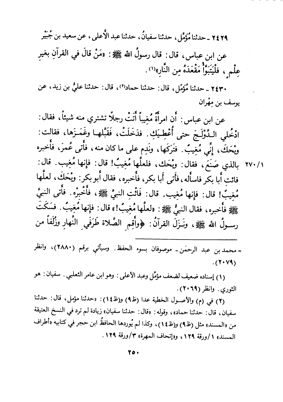 ٢٤٣٠ - حَدَّثَنَا مُؤَمَّلٌ، قَالَ: حَدَّثَنَا حَمَّادٌ، (٢) قَالَ: حَدَّثَنَا عَلِيُّ بْنُ زَيْدٍ، عَنْ يُوسُفَ بْنِ مِهْرَانَ، عَنِ ابْنِ عَبَّاسٍ: أَنَّ امْرَأَةً مُغِيبًا أَتَتْ رَجُلًا تَشْتَرِي مِنْهُ شَيْئًا، فَقَالَ: ادْخُلِي الدَّوْلَجَ حَتَّى أُعْطِيَكِ، فَدَخَلَتْ، فَقَبَّلَهَا وَغَمَزَهَا، فَقَالَتْ: وَيْحَكَ إِنِّي مُغِيبٌ، فَتَرَكَهَا، وَنَدِمَ عَلَى مَا كَانَ مِنْهُ، فَأَتَى عُمَرَ، فَأَخْبَرَهُ بِالَّذِي صَنَعَ، فَقَالَ: وَيْحَكَ، فَلَعَلَّهَا مُغِيبٌ قَالَ: فَإِنَّهَا مُغِيبٌ، قَالَ: فَائْتِ أَبَا بَكْرٍ، فَاسْأَلْهُ فَأَتَى أَبَا بَكْرٍ، فَأَخْبَرَهُ، فَقَالَ أَبُو بَكْرٍ: وَيْحَكَ لَعَلَّهَا مُغِيبٌ قَالَ: فَإِنَّهَا مُغِيبٌ قَالَ: فَائْتِ النَّبِيَّ صَلَّى اللهُ عَلَيْهِ وَسَلَّمَ، فَأَخْبِرْهُ، فَأَتَى النَّبِيَّ صَلَّى اللهُ عَلَيْهِ وَسَلَّمَ فَأَخْبَرَهُ، فَقَالَ النَّبِيُّ صَلَّى اللهُ عَلَيْهِ وَسَلَّمَ: " لَعَلَّهَا مُغِيبٌ " قَالَ: فَإِنَّهَا مُغِيبٌ، فَسَكَتَ رَسُولُ اللهِ صَلَّى اللهُ عَلَيْهِ وَسَلَّمَ، وَنَزَلَ الْقُرْآنُ {وَأَقِمِ الصَّلاةَ طَرَفَيِ النَّهَارِ وَزُلَفًا مِنَ
