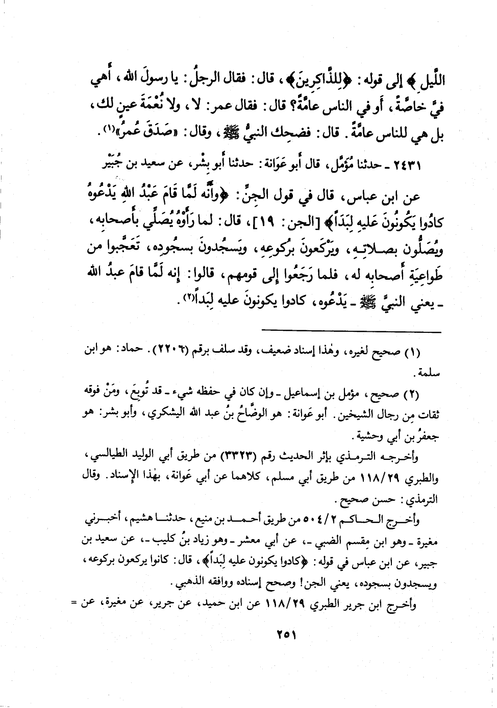 ٢٤٣١ - حَدَّثَنَا مُؤَمَّلٌ، قَالَ أَبُو عَوَانَةَ: حَدَّثَنَا أَبُو بِشْرٍ، عَنْ سَعِيدِ بْنِ جُبَيْرٍ، عَنِ ابْنِ عَبَّاسٍ، قَالَ فِي قَوْلِ الْجِنِّ: {وَأَنَّهُ لَمَّا قَامَ عَبْدُ اللهِ يَدْعُوهُ كَادُوا يَكُونُونَ عَلَيْهِ لِبَدًا} [الجن: ١٩] ، قَالَ: " لَمَّا رَأَوْهُ يُصَلِّي بِأَصْحَابِهِ، وَيُصَلُّونَ بِصَلاتِهِ، وَيَرْكَعُونَ بِرُكُوعِهِ، وَيَسْجُدُونَ بِسُجُودِهِ، تَعَجَّبُوا مِنْ طَوَاعِيَةِ أَصْحَابِهِ لَهُ، فَلَمَّا رَجَعُوا إِلَى قَوْمِهِمْ، قَالُوا: إِنَّهُ لَمَّا قَامَ عَبْدُ اللهِ - يَعْنِي النَّبِيَّ صَلَّى اللهُ عَلَيْهِ وَسَلَّمَ -، يَدْعُوهُ كَادُوا يَكُونُونَ عَلَيْهِ لِبَدًا " (٢)