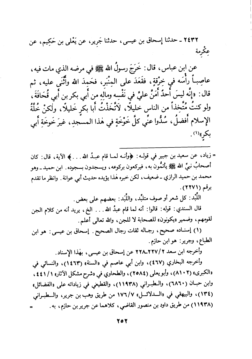 ٢٤٣٢ - حَدَّثَنَا إِسْحَاقُ بْنُ عِيسَى، حَدَّثَنَا جَرِيرٌ، عَنْ يَعْلَى بْنِ حَكِيمٍ، عَنْ عِكْرِمَةَ، عَنِ ابْنِ عَبَّاسٍ، قَالَ: خَرَجَ رَسُولُ اللهِ صَلَّى اللهُ عَلَيْهِ وَسَلَّمَ فِي مَرَضِهِ الَّذِي مَاتَ فِيهِ، عَاصِبًا رَأْسَهُ فِي خِرْقَةٍ، فَقَعَدَ عَلَى الْمِنْبَرِ، فَحَمِدَ اللهَ وَأَثْنَى عَلَيْهِ، ثُمَّ قَالَ: " إِنَّهُ لَيْسَ أَحَدٌ أَمَنَّ عَلَيَّ فِي نَفْسِهِ وَمَالِهِ مِنْ أَبِي بَكْرِ بْنِ أَبِي قُحَافَةَ، وَلَوْ كُنْتُ مُتَّخِذًا مِنَ النَّاسِ خَلِيلًا لاتَّخَذْتُ أَبَا بَكْرٍ خَلِيلًا، وَلَكِنْ خُلَّةُ الْإِسْلامِ أَفْضَلُ، سُدُّوا عَنِّي كُلَّ خَوْخَةٍ فِي هَذَا الْمَسْجِدِ غَيْرَ خَوْخَةِ أَبِي بَكْرٍ " (١)