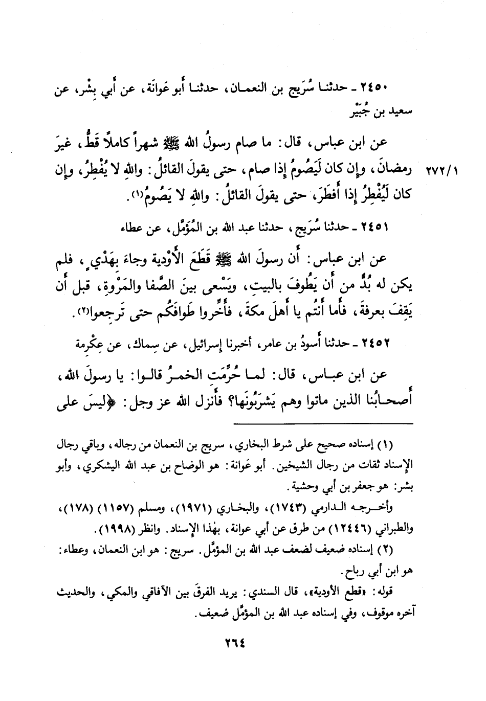 ٢٤٥٠ - حَدَّثَنَا سُرَيْجُ بْنُ النُّعْمَانِ، حَدَّثَنَا أَبُو عَوَانَةَ، عَنْ أَبِي بِشْرٍ، عَنْ سَعِيدِ بْنِ جُبَيْرٍ، عَنِ ابْنِ عَبَّاسٍ، قَالَ: " مَا صَامَ رَسُولُ اللهِ صَلَّى اللهُ عَلَيْهِ وَسَلَّمَ، شَهْرًا كَامِلًا قَطُّ، غَيْرَ رَمَضَانَ، وَإِنْ كَانَ لَيَصُومُ إِذَا صَامَ، حَتَّى يَقُولَ الْقَائِلُ: وَاللهِ لَا يُفْطِرُ، وَإِنْ كَانَ لَيُفْطِرُ إِذَا أَفْطَرَ، حَتَّى يَقُولَ الْقَائِلُ: وَاللهِ لَا يَصُومُ " (١)