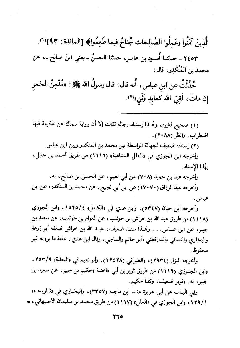 ٢٤٥٣ - حَدَّثَنَا أَسْوَدُ بْنُ عَامِرٍ، حَدَّثَنَا الْحَسَنُ يَعْنِي ابْنَ صَالِحٍ، عَنْ مُحَمَّدِ بْنِ الْمُنْكَدِرِ، قَالَ: حُدِّثْتُ عَنِ ابْنِ عَبَّاسٍ، أَنَّهُ قَالَ: قَالَ رَسُولُ اللهِ صَلَّى اللهُ عَلَيْهِ وَسَلَّمَ: " مُدْمِنُ الْخَمْرِ إِنْ مَاتَ، لَقِيَ اللهَ كَعَابِدِ وَثَنٍ " (٢)