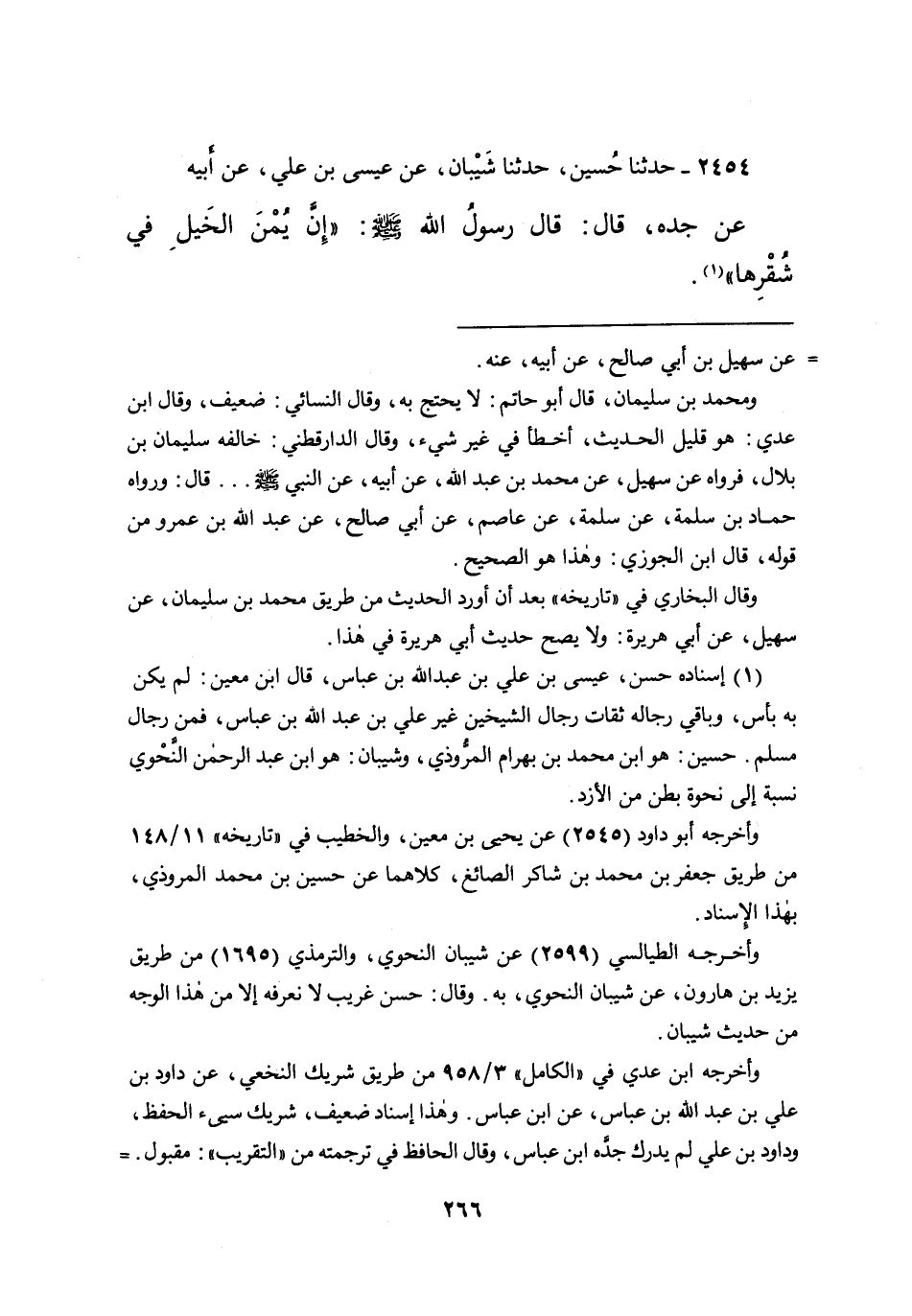 ٢٤٥٤ - حَدَّثَنَا حُسَيْنٌ، حَدَّثَنَا شَيْبَانُ، عَنْ عِيسَى بْنِ عَلِيٍّ، عَنْ أَبِيهِ عَنْ جَدِّهِ قَالَ: قَالَ رَسُولُ اللهِ صَلَّى اللهُ عَلَيْهِ وَسَلَّمَ: " إِنَّ يُمْنَ الْخَيْلِ فِي شُقْرِهَا " (١)