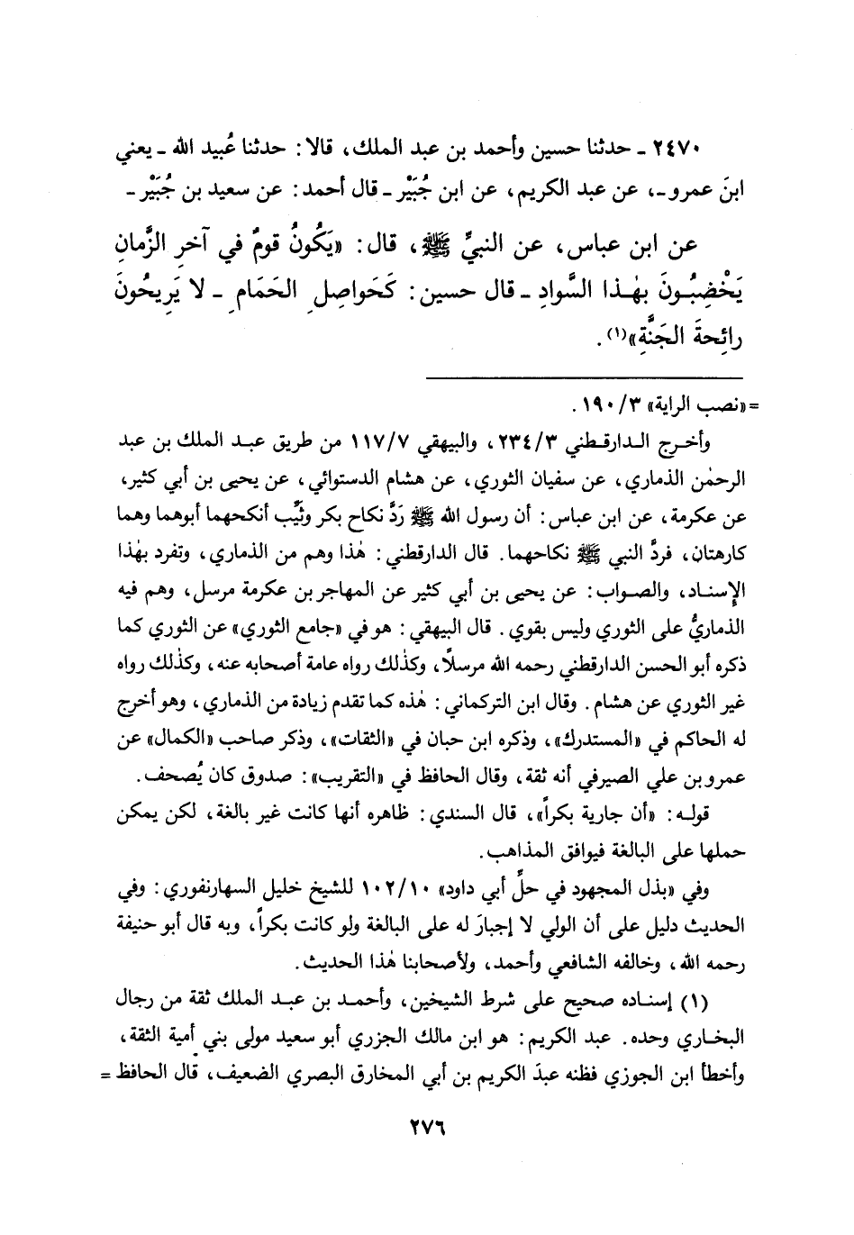 ٢٤٧٠ - حَدَّثَنَا حُسَيْنٌ، وَأَحْمَدُ بْنُ عَبْدِ الْمَلِكِ، قَالا: حَدَّثَنَا عُبَيْدُ اللهِ يَعْنِي ابْنَ عَمْرٍو، عَنْ عَبْدِ الْكَرِيمِ، عَنِ ابْنِ جُبَيْرٍ، قَالَ: أَحْمَدُ، عَنْ سَعِيدِ بْنِ جُبَيْرٍ، عَنِ ابْنِ عَبَّاسٍ، عَنِ النَّبِيِّ صَلَّى اللهُ عَلَيْهِ وَسَلَّمَ قَالَ: " يَكُونُ قَوْمٌ فِي آخِرِ الزَّمَانِ يَخْضِبُونَ بِهَذَا السَّوَادِ - قَالَ حُسَيْنٌ كَحَوَاصِلِ الْحَمَامِ - لَا يَرِيحُونَ رَائِحَةَ الْجَنَّةِ " (١)