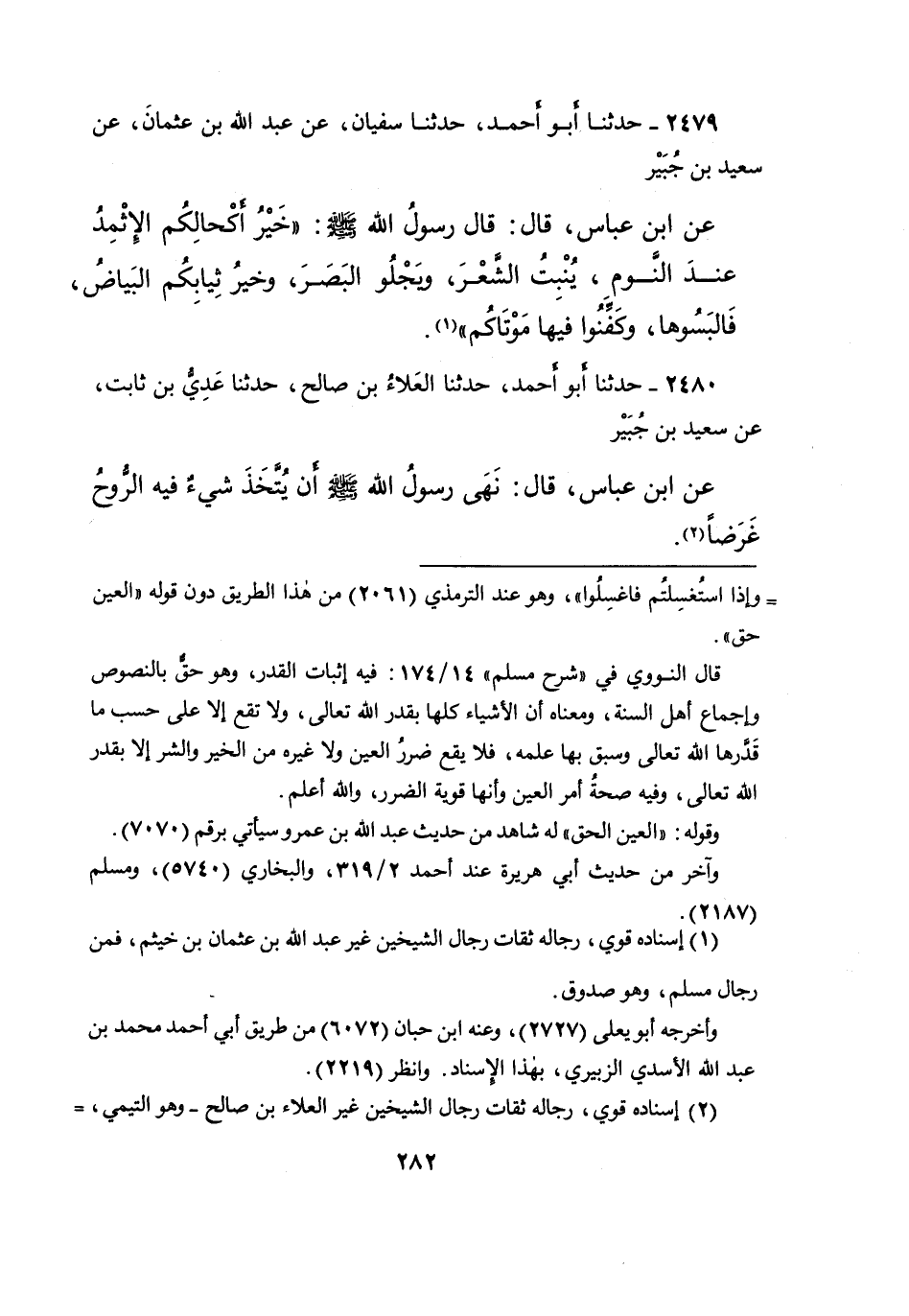 ٢٤٧٩ - حَدَّثَنَا أَبُو أَحْمَدَ، حَدَّثَنَا سُفْيَانُ، عَنْ عَبْدِ اللهِ بْنِ عُثْمَانَ، عَنْ سَعِيدِ بْنِ جُبَيْرٍ، عَنِ ابْنِ عَبَّاسٍ، قَالَ: قَالَ رَسُولُ اللهِ صَلَّى اللهُ عَلَيْهِ وَسَلَّمَ: " خَيْرُ أَكْحَالِكُمُ الْإِثْمِدُ عِنْدَ النَّوْمِ، يُنْبِتُ الشَّعْرَ، وَيَجْلُو الْبَصَرَ، وَخَيْرُ ثِيَابِكُمِ الْبَيَاضُ، فَالْبَسُوهَا، وَكَفِّنُوا فِيهَا مَوْتَاكُمْ " (١)