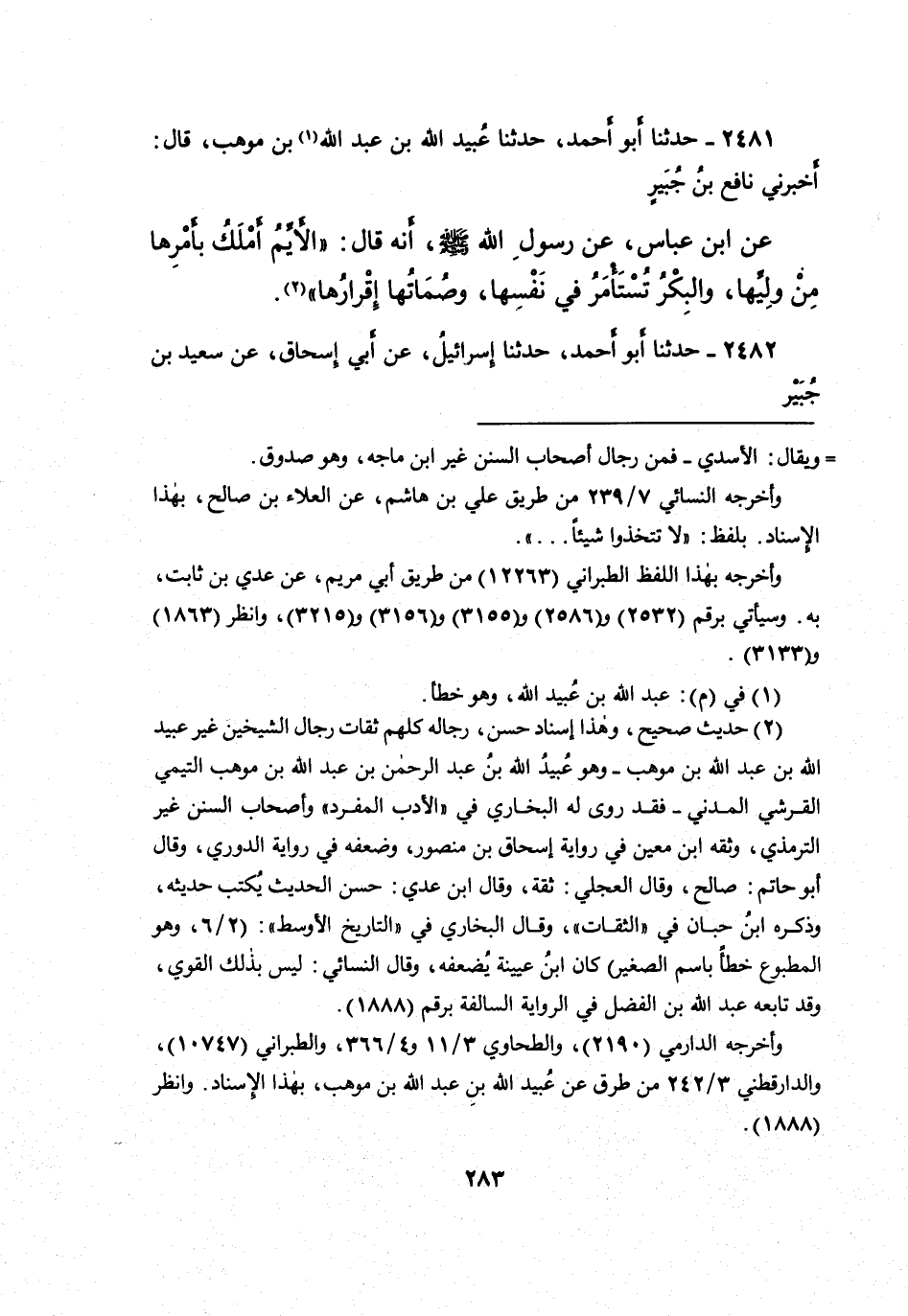 ٢٤٨١ - حَدَّثَنَا أَبُو أَحْمَدَ، حَدَّثَنَا عُبَيْدُ اللهِ بْنُ عَبْدِ اللهِ بْنِ مَوْهَبٍ، قَالَ: أَخْبَرَنِي نَافِعُ بْنُ جُبَيْرٍ، عَنِ ابْنِ عَبَّاسٍ، عَنْ رَسُولِ اللهِ صَلَّى اللهُ عَلَيْهِ وَسَلَّمَ، أَنَّهُ قَالَ: " الْأَيِّمُ أَمْلَكُ بِأَمْرِهَا مِنْ وَلِيِّهَا، وَالْبِكْرُ تُسْتَأْمَرُ فِي نَفْسِهَا، وَصُمَاتُهَا إِقْرَارُهَا " (١)