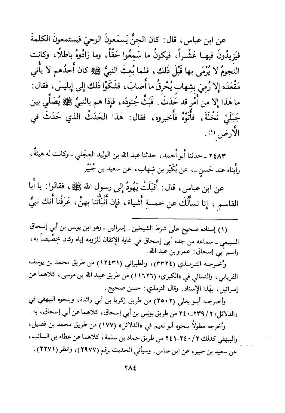 ٢٤٨٣ - حَدَّثَنَا أَبُو أَحْمَدَ، حَدَّثَنَا عَبْدُ اللهِ بْنُ الْوَلِيدِ الْعِجْلِيُّ، وَكَانَتْ لَهُ هَيْئَةٌ رَأَيْنَاهُ عِنْدَ حَسَنٍ، عَنْ بُكَيْرِ بْنِ شِهَابٍ، عَنْ سَعِيدِ بْنِ جُبَيْرٍ، عَنِ ابْنِ عَبَّاسٍ، قَالَ: أَقْبَلَتْ يَهُودُ إِلَى رَسُولِ اللهِ صَلَّى اللهُ عَلَيْهِ وَسَلَّمَ، فَقَالُوا: يَا أَبَا الْقَاسِمِ إِنَّا نَسْأَلُكَ عَنْ خَمْسَةِ أَشْيَاءَ، فَإِنْ أَنْبَأْتَنَا بِهِنَّ، عَرَفْنَا أَنَّكَ نَبِيٌّ