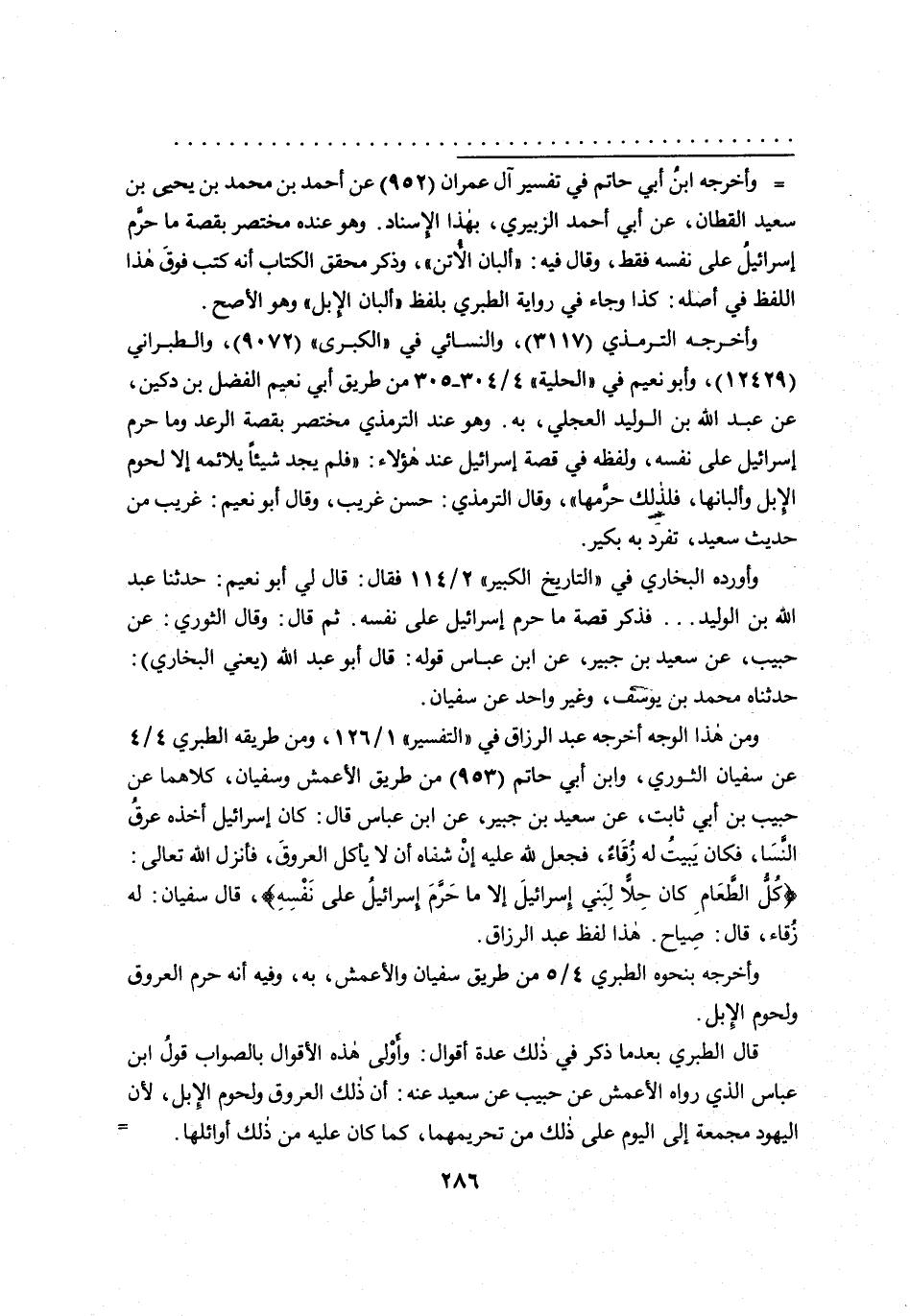 = وأخرجه ابن أبي حاتم في تفسير آل عمران (٩٥٢) عن أحمد بن محمد بن يحيى بن سعيد القطان، عن أبي أحمد الزبيري، بهذا الإسناد. وهو عنده مختصر بقصة ما حرم إسرائيلُ على نفسه فقط، وقال فيه: "ألبان الأتن"، وذكر محقق الكتاب أنه كتب فوقَ هذا اللفظ في أصله: كذا وجاء في رواية الطبري بلفظ "ألبان الإبل" وهو الأصح.