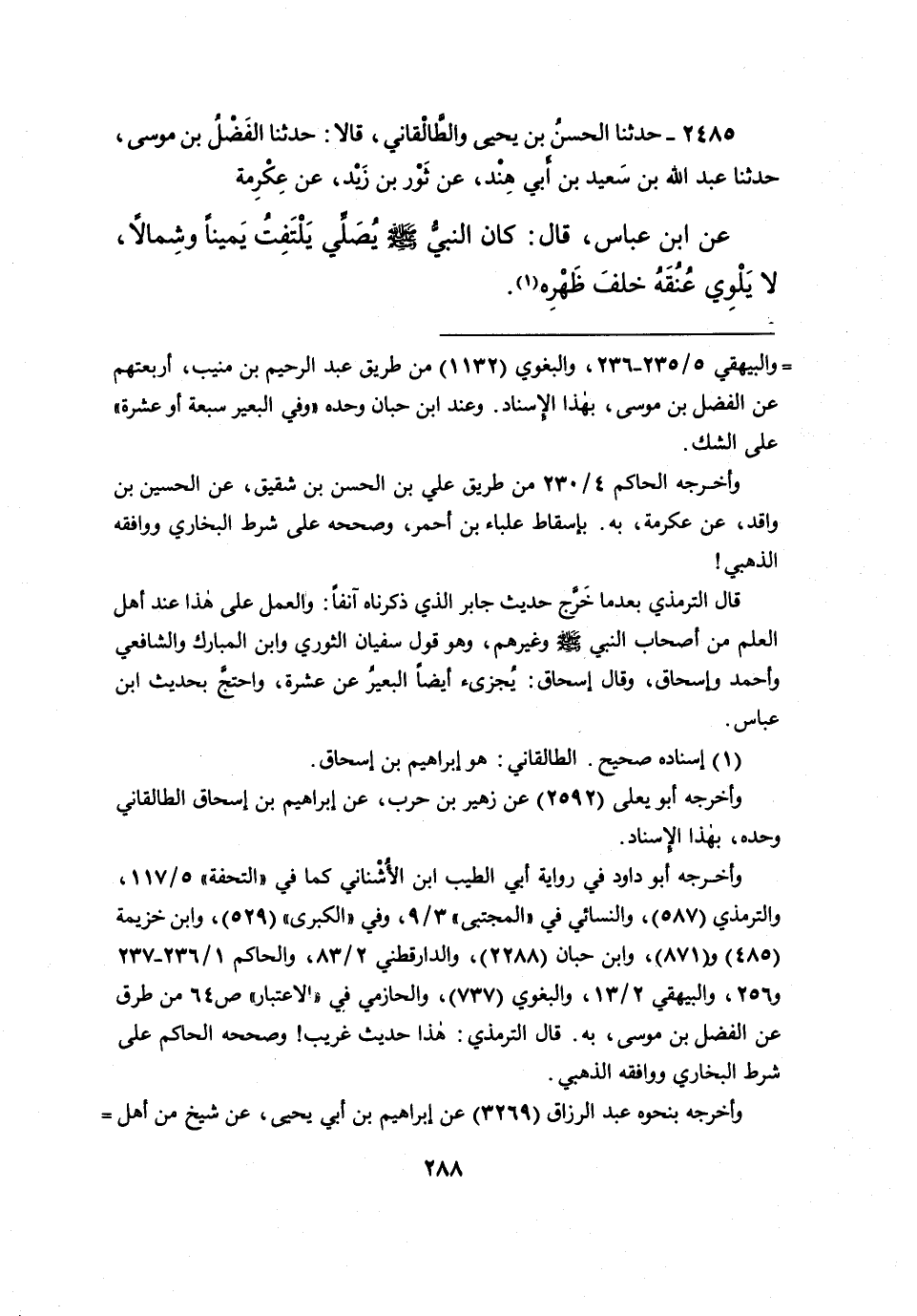 ٢٤٨٥ - حَدَّثَنَا الْحَسَنُ بْنُ يَحْيَى، وَالطَّالَقَانِيُّ، قَالا: حَدَّثَنَا الْفَضْلُ بْنُ مُوسَى، حَدَّثَنَا عَبْدُ اللهِ بْنُ سَعِيدِ بْنِ أَبِي هِنْدٍ، عَنْ ثَوْرِ بْنِ زَيْدٍ، عَنْ عِكْرِمَةَ، عَنِ ابْنِ عَبَّاسٍ، قَالَ: " كَانَ النَّبِيُّ صَلَّى اللهُ عَلَيْهِ وَسَلَّمَ يُصَلِّي يَلْتَفِتُ يَمِينًا وَشِمَالًا، لَا يَلْوِي عُنُقَهُ خَلْفَ ظَهْرِهِ "، (١)