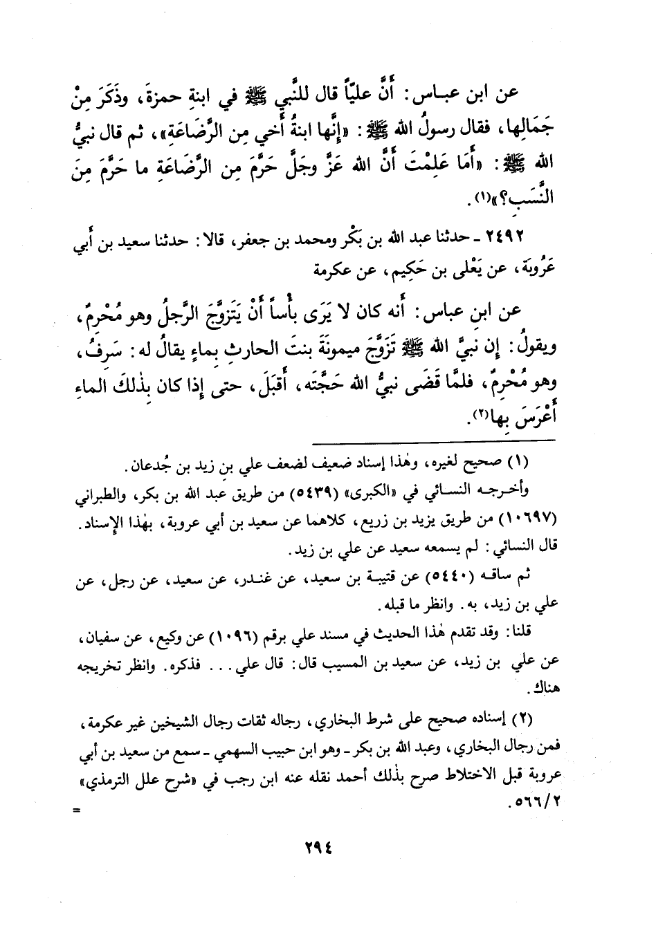 عَنِ ابْنِ عَبَّاسٍ، أَنَّ عَلِيًّا، قَالَ لِلنَّبِيِّ صَلَّى اللهُ عَلَيْهِ وَسَلَّمَ، فِي ابْنَةِ حَمْزَةَ: وَذَكَرَ مِنْ جَمَالِهَا، فَقَالَ رَسُولُ اللهِ صَلَّى اللهُ عَلَيْهِ وَسَلَّمَ: " إِنَّهَا ابْنَةُ أَخِي مِنَ الرَّضَاعَةِ "، ثُمَّ قَالَ نَبِيُّ اللهِ صَلَّى اللهُ عَلَيْهِ وَسَلَّمَ: " أَمَا عَلِمْتَ أَنَّ اللهَ عَزَّ وَجَلَّ حَرَّمَ مِنَ الرَّضَاعَةِ مَا حَرَّمَ مِنَ النَّسَبِ " (١)