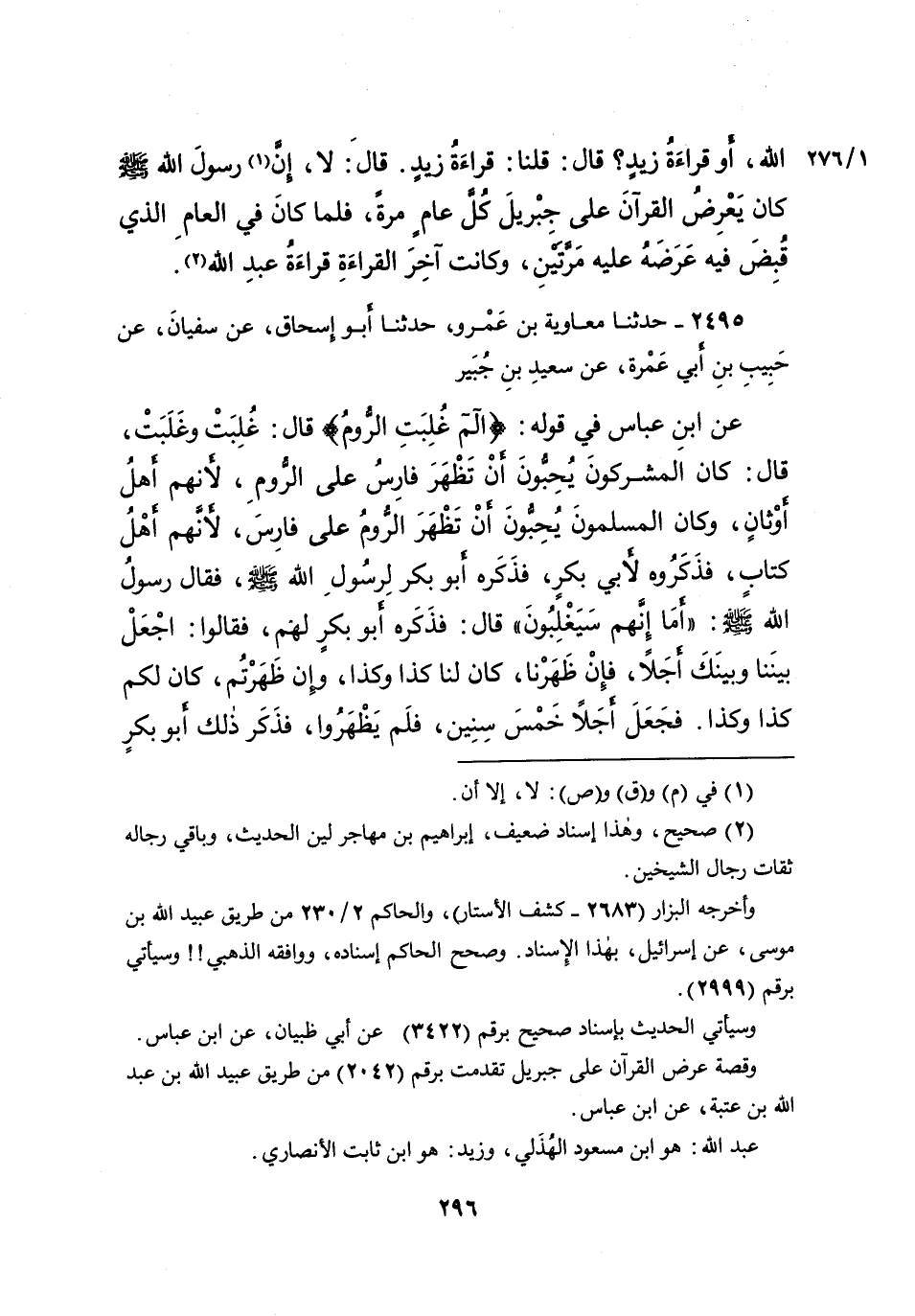 ٢٤٩٥ - حَدَّثَنَا مُعَاوِيَةُ بْنُ عَمْرٍو، حَدَّثَنَا أَبُو إِسْحَاقَ، عَنْ سُفْيَانَ، عَنْ حَبِيبِ بْنِ أَبِي عَمْرَةَ، عَنْ سَعِيدِ بْنِ جُبَيْرٍ، عَنِ ابْنِ عَبَّاسٍ، فِي قَوْلِهِ: {الم غُلِبَتِ الرُّومُ} [الروم: ٢] ، قَالَ: غُلِبَتْ وَغَلَبَتْ، قَالَ: كَانَ الْمُشْرِكُونَ يُحِبُّونَ أَنْ تَظْهَرَ فَارِسُ عَلَى الرُّومِ، لِأَنَّهُمْ أَهْلُ أَوْثَانٍ، وَكَانَ الْمُسْلِمُونَ يُحِبُّونَ أَنْ تَظْهَرَ الرُّومُ عَلَى فَارِسَ، لِأَنَّهُمْ أَهْلُ كِتَابٍ، فَذَكَرُوهُ لِأَبِي بَكْرٍ، فَذَكَرَهُ أَبُو بَكْرٍ لِرَسُولِ اللهِ صَلَّى اللهُ عَلَيْهِ وَسَلَّمَ، فَقَالَ رَسُولُ اللهِ صَلَّى اللهُ عَلَيْهِ وَسَلَّمَ: " أَمَا إِنَّهُمْ سَيَغْلِبُونَ " قَالَ: فَذَكَرَهُ أَبُو بَكْرٍ لَهُمْ، فَقَالُوا: اجْعَلْ بَيْنَنَا وَبَيْنَكَ أَجَلًا، فَإِنْ ظَهَرْنَا، كَانَ لَنَا كَذَا وَكَذَا، وَإِنْ ظَهَرْتُمْ، كَانَ لَكُمْ كَذَا وَكَذَا، فَجَعَلَ أَجَلًا خَمْسَ سِنِينَ، فَلَمْ يَظْهَرُوا، فَذَكَرَ ذَلِكَ أَبُو بَكْرٍ