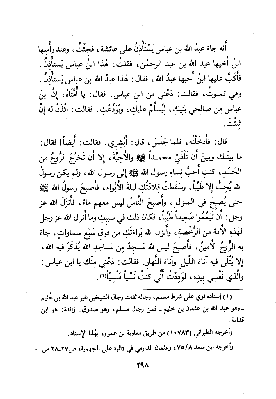أَنَّهُ جَاءَ عَبْدُ اللهِ بْنُ عَبَّاسٍ، يَسْتَأْذِنُ عَلَى عَائِشَةَ، فَجِئْتُ وَعِنْدَ رَأْسِهَا ابْنُ أَخِيهَا عَبْدُ اللهِ بِنُ عَبْدِ الرَّحْمَنِ، فَقُلْتُ: هَذَا ابْنُ عَبَّاسٍ يَسْتَأْذِنُ، فَأَكَبَّ عَلَيْهَا ابْنُ أَخِيهَا عَبْدُ اللهِ، فَقَالَ: هَذَا عَبْدُ اللهِ بْنُ عَبَّاسٍ يَسْتَأْذِنُ، وَهِيَ تَمُوتُ، فَقَالَتْ: دَعْنِي مِنَ ابْنِ عَبَّاسٍ، فَقَالَ: يَا أُمَّتَاهُ، إِنَّ ابْنَ عَبَّاسٍ مِنْ صَالِحِي بَنِيكِ، لِيُسَلِّمْ عَلَيْكِ، وَيُوَدِّعْكِ، فَقَالَتْ: ائْذَنْ لَهُ إِنْ شِئْتَ، قَالَ: فَأَدْخَلْتُهُ، فَلَمَّا جَلَسَ، قَالَ: أَبْشِرِي، فَقَالَتْ: أَيْضًا فَقَالَ: " مَا بَيْنَكِ وَبَيْنَ أَنْ تَلْقَيْ مُحَمَّدًا صَلَّى اللهُ عَلَيْهِ وَسَلَّمَ وَالْأَحِبَّةَ، إِلا أَنْ تَخْرُجَ الرُّوحُ مِنَ الجَسَدِ، كُنْتِ أَحَبَّ نِسَاءِ رَسُولِ اللهِ صَلَّى اللهُ عَلَيْهِ وَسَلَّمَ، إِلَى رَسُولِ اللهِ، وَلَمْ يَكُنْ رَسُولُ اللهِ يُحِبُّ إِلا طَيِّبًا "، وَسَقَطَتْ قِلادَتُكِ لَيْلَةَ الْأَبْوَاءِ، " فَأَصْبَحَ رَسُولُ اللهِ صَلَّى اللهُ عَلَيْهِ وَسَلَّمَ، حَتَّى يُصْبِحَ فِي الْمَنْزِلِ، وَأَصْبَحَ النَّاسُ لَيْسَ مَعَهُمْ مَاءٌ " فَأَنْزَلَ اللهُ عَزَّ وَجَلَّ: {فَتَيَمَّمُوا صَعِيدًا طَيِّبًا} [النساء: ٤٣] ، فَكَانَ ذَلِكَ فِي سَبَبِكِ وَمَا أَنْزَلَ اللهُ عَزَّ وَجَلَّ لِهَذِهِ الْأُمَّةِ مِنَ الرُّخْصَةِ، وَأَنْزَلَ اللهُ بَرَاءَتَكِ مِنْ فَوْقِ سَبْعِ سَمَاوَاتٍ، جَاءَ بِهِ الرُّوحُ الْأَمِينُ، فَأَصْبَحَ لَيْسَ لِلَّهِ مَسْجِدٌ مِنْ مَسَاجِدِ اللهِ يُذْكَرُ فِيهِ اللهُ، إِلا يُتْلَى فِيهِ آنَاءَ اللَّيْلِ وَآنَاءَ النَّهَارِ، فَقَالَتْ: دَعْنِي مِنْكَ يَا ابْنَ عَبَّاسٍ: وَالَّذِي نَفْسِي بِيَدِهِ، لَوَدِدْتُ أَنِّي كُنْتُ نَسْيًا مَنْسِيًّا (١)