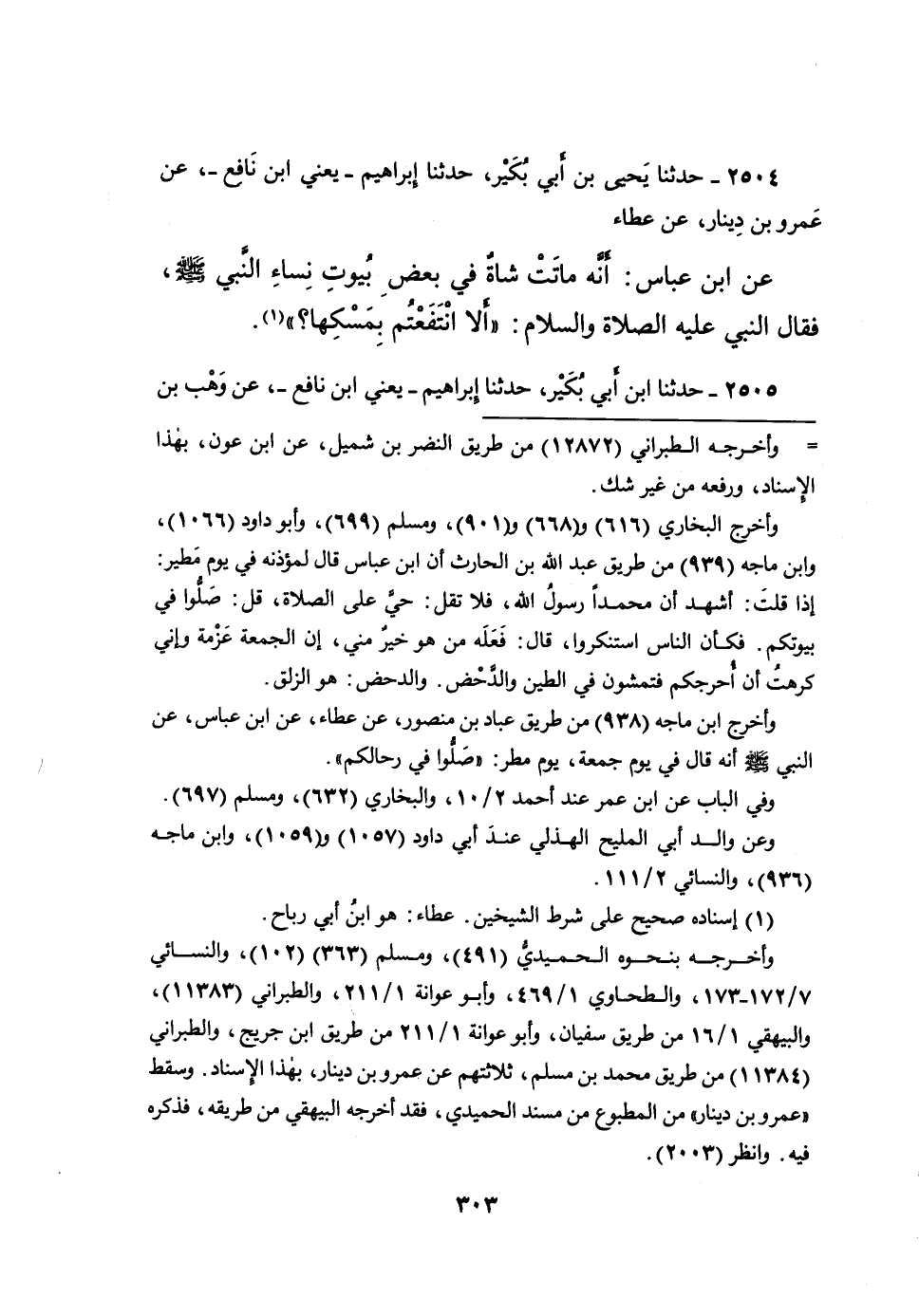 ٢٥٠٤ - حَدَّثَنَا يَحْيَى بْنُ أَبِي بُكَيْرٍ، حَدَّثَنَا إِبْرَاهِيمُ يَعْنِي ابْنَ نَافِعٍ، عَنْ عَمْرِو بْنِ دِينَارٍ، عَنْ عَطَاءٍ، عَنِ ابْنِ عَبَّاسٍ، أَنَّهُ مَاتَتْ شَاةٌ فِي بَعْضِ بُيُوتِ نِسَاءِ النَّبِيِّ صَلَّى اللهُ عَلَيْهِ وَسَلَّمَ، فَقَالَ النَّبِيُّ عَلَيْهِ الصَّلَاةُ وَالسَّلَامُ: " أَلَا انْتَفَعْتُمْ بِمَسْكِهَا؟ " (١)