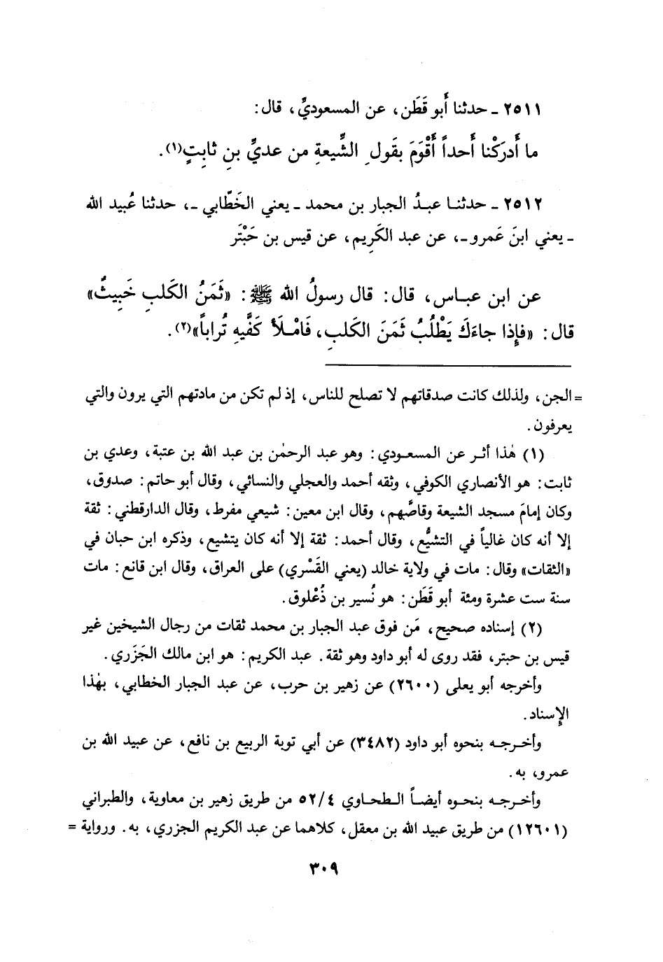 ٢٥١٢ - حَدَّثَنَا عَبْدُ الْجَبَّارِ بْنُ مُحَمَّدٍ يَعْنِي الْخَطَّابِيَّ، حَدَّثَنَا عُبَيْدُ اللهِ يَعْنِي ابْنَ عَمْرٍو، عَنْ عَبْدِ الْكَرِيمِ، عَنْ قَيْسِ بْنِ حَبْتَرٍ، عَنِ ابْنِ عَبَّاسٍ، قَالَ: قَالَ رَسُولُ اللهِ صَلَّى اللهُ عَلَيْهِ وَسَلَّمَ: " ثَمَنُ الْكَلْبِ خَبِيثٌ "، قَالَ: " فَإِذَا جَاءَكَ يَطْلُبُ ثَمَنَ الْكَلْبِ، فَامْلَأ كَفَّيْهِ تُرَابًا " (٢)