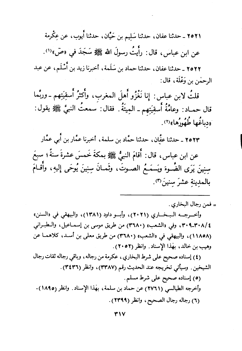 ٢٥٢١ - حَدَّثَنَا عَفَّانُ، حَدَّثَنَا سَلِيمُ بْنُ حَيَّانَ، حَدَّثَنَا أَيُّوبُ، عَنْ عِكْرِمَةَ، عَنِ ابْنِ عَبَّاسٍ، قَالَ: " رَأَيْتُ رَسُولَ اللهِ صَلَّى اللهُ عَلَيْهِ وَسَلَّمَ، سَجَدَ فِي ص " (١)