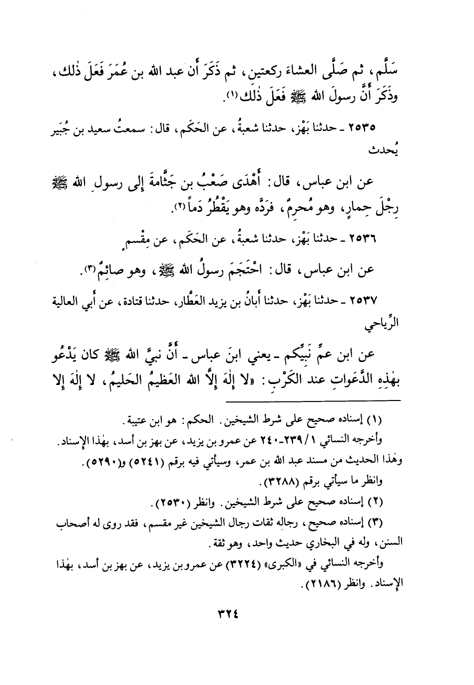 ٢٥٣٥ - حَدَّثَنَا بَهْزٌ، حَدَّثَنَا شُعْبَةُ، عَنِ الْحَكَمِ، قَالَ: سَمِعْتُ سَعِيدَ بْنَ جُبَيْرٍ، يُحَدِّثُ عَنِ ابْنِ عَبَّاسٍ، قَالَ: " أَهْدَى صَعْبُ بْنُ جَثَّامَةَ إِلَى رَسُولِ اللهِ صَلَّى اللهُ عَلَيْهِ وَسَلَّمَ، رِجْلَ حِمَارٍ وَهُوَ مُحْرِمٌ فَرَدَّهُ وَهُوَ يَقْطُرُ دَمًا " (٢)