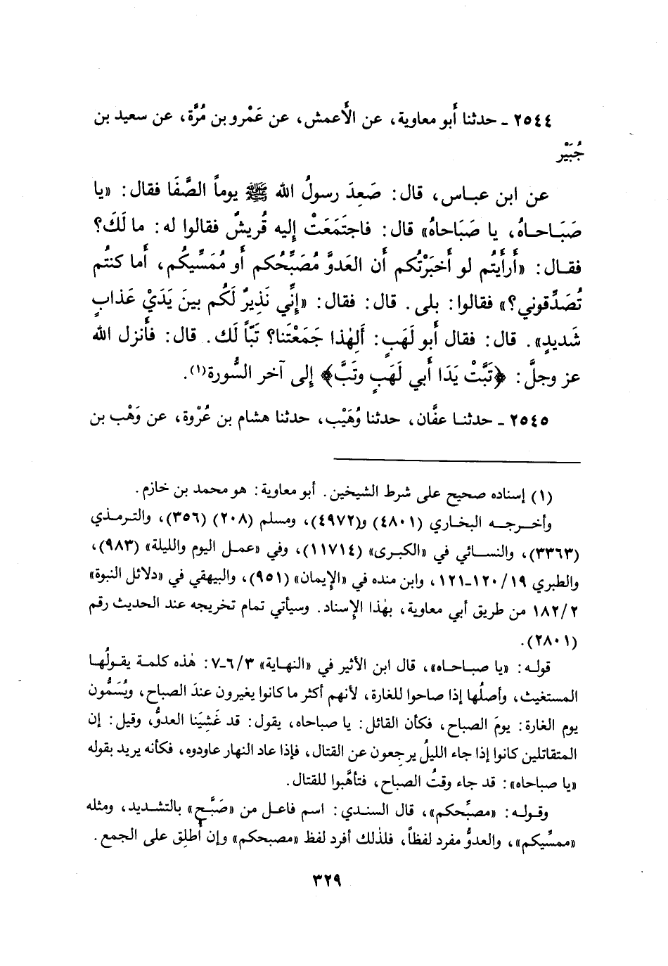 ٢٥٤٤ - حَدَّثَنَا أَبُو مُعَاوِيَةَ، عَنِ الْأَعْمَشِ، عَنْ عَمْرِو بْنِ مُرَّةَ، عَنْ سَعِيدِ بْنِ جُبَيْرٍ، عَنِ ابْنِ عَبَّاسٍ، قَالَ: صَعِدَ رَسُولُ اللهِ صَلَّى اللهُ عَلَيْهِ وَسَلَّمَ يَوْمًا الصَّفَا فَقَالَ: " يَا صَبَاحَاهْ، يَا صَبَاحَاهْ " قَالَ: فَاجْتَمَعَتْ إِلَيْهِ قُرَيْشٌ فَقَالُوا لَهُ: مَا لَكَ؟ فَقَالَ: " أَرَأَيْتُمْ لَوْ أخْبَرْتُكُمْ أنَّ الْعَدُوَّ مُصَبِّحُكُمْ أَوْ مُمَسِّيكُمْ، أَمَا كُنْتُمْ تُصَدِّقُونِي؟ " فَقَالُوا: بَلَى قَالَ: فَقَالَ: " إِنِّي نَذِيرٌ لَكُمْ بَيْنَ يَدَيْ عَذَابٍ شَدِيدٍ " قَالَ: فَقَالَ أَبُو لَهَبٍ: أَلِهَذَا جَمَعْتَنَا؟ تَبًّا لَكَ، قَالَ: فَأَنْزَلَ اللهُ عَزَّ وَجَلَّ: {تَبَّتْ يَدَا أَبِي لَهَبٍ وَتَبَّ} [المسد: ١] إِلَى آخِرِ السُّورَةِ (١)