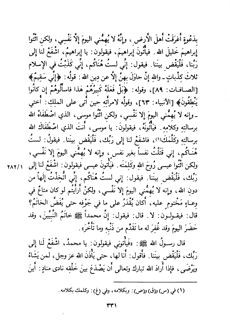 بِدَعْوَةٍ أَغْرَقَتْ أَهْلَ الْأَرْضِ، وَإِنَّهُ لَا يُهِمُّنِي الْيَوْمَ إِلا نَفْسِي، وَلَكِنِ ائْتُوا إِبْرَاهِيمَ خَلِيلَ اللهِ، فَيَأْتُونَ إِبْرَاهِيمَ، فَيَقُولُونَ: يَا إِبْرَاهِيمُ، اشْفَعْ لَنَا إِلَى رَبِّنَا، فَلْيَقْضِ بَيْنَنَا، فَيَقُولُ: إِنِّي لَسْتُ هُنَاكُمْ، إِنِّي كَذَبْتُ فِي الْإِسْلامِ ثَلاثَ كِذْبَاتٍ - وَاللهِ إِنْ حَاوَلَ بِهِنَّ إِلا عَنْ دِينِ اللهِ: قَوْلُهُ: {إِنِّي سَقِيمٌ} [الصافات: ٨٩] وَقَوْلُهُ: {بَلْ فَعَلَهُ كَبِيرُهُمْ هَذَا فَاسْأَلُوهُمْ إِنْ كَانُوا يَنْطِقُونَ} [الأنبياء: ٦٣] ، وَقَوْلُهُ لِامْرَأَتِهِ حِينَ أَتَى عَلَى الْمَلِكِ: أُخْتِي - وَإِنَّهُ لَا يُهِمُّنِي الْيَوْمَ إِلا نَفْسِي، وَلَكِنِ ائْتُوا مُوسَى الَّذِي اصْطَفَاهُ اللهُ بِرِسَالَتِهِ وَكَلامِهِ، فَيَأْتُونَهُ، فَيَقُولُونَ: يَا مُوسَى، أَنْتَ الَّذِي اصْطَفَاكَ اللهُ بِرِسَالَتِهِ وَكَلَّمَكَ، (١) فَاشْفَعْ لَنَا إِلَى رَبِّكَ، فَلْيَقْضِ بَيْنَنَا، فَيَقُولُ: لَسْتُ هُنَاكُمْ إِنِّي قَتَلْتُ نَفْسًا بِغَيْرِ نَفْسٍ، وَإِنَّهُ لَا يُهِمُّنِي الْيَوْمَ إِلا نَفْسِي، وَلَكِنِ ائْتُوا عِيسَى رُوحَ اللهِ وَكَلِمَتَهُ، فَيَأْتُونَ عِيسَى فَيَقُولُونَ: اشْفَعْ لَنَا إِلَى رَبِّكَ، فَلْيَقْضِ بَيْنَنَا. فَيَقُولُ: إِنِّي لَسْتُ هُنَاكُمْ، إِنِّي اتُّخِذْتُ إِلَهًا مِنْ دُونِ اللهِ، وَإِنَّهُ لَا يُهِمُّنِي الْيَوْمَ إِلا نَفْسِي، وَلَكِنْ أَرَأَيْتُمْ لَوْ كَانَ مَتَاعٌ فِي وِعَاءٍ مَخْتُومٍ عَلَيْهِ، أَكَانَ يُقْدَرُ عَلَى مَا فِي جَوْفِهِ حَتَّى يُفَضَّ الْخَاتَمُ؟ قَالَ: فَيَقُولُونَ: لَا، قَالَ: فَيَقُولُ إِنَّ مُحَمَّدًا صَلَّى اللهُ عَلَيْهِ وَسَلَّمَ خَاتَمُ النَّبِيِّينَ، وَقَدْ حَضَرَ الْيَوْمَ وَقَدْ غُفِرَ لَهُ مَا تَقَدَّمَ مِنْ ذَنْبِهِ وَمَا تَأَخَّرَ " قَالَ رَسُولُ اللهِ صَلَّى اللهُ عَلَيْهِ وَسَلَّمَ: " فَيَأْتُونِي فَيَقُولُونَ: يَا مُحَمَّدُ، اشْفَعْ لَنَا إِلَى رَبِّكَ، فَلْيَقْضِ بَيْنَنَا، فَأَقُولُ: أَنَا لَهَا، حَتَّى يَأْذَنَ اللهُ عَزَّ وَجَلَّ، لِمَنْ شَاءَ وَيَرْضَى، فَإِذَا أَرَادَ اللهُ تَبَارَكَ وَتَعَالَى أَنْ يَصْدَعَ بَيْنَ خَلْقِهِ نَادَى مُنَادٍ: أَيْنَ