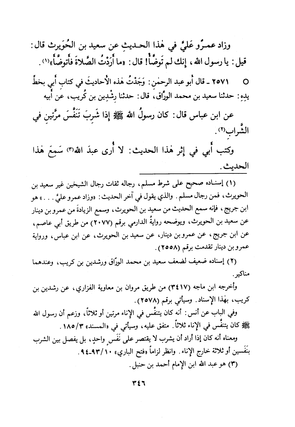 ° ٢٥٧١ - قَالَ أَبُو عَبْدِ الرَّحْمَنِ: وَجَدْتُ هَذِهِ الْأحَادِيثَ فِي كِتَابِ أَبِي بِخَطِّ يَدِهِ، حَدَّثَنَا سَعِيدُ بْنُ مُحَمَّدٍ الْوَرَّاقُ، قَالَ: حَدَّثَنَا رِشْدِينُ بْنُ كُرَيْبٍ، عَنْ أَبِيهِ، عَنِ ابْنِ عَبَّاسٍ، قَالَ: " كَانَ رَسُولُ اللهِ صَلَّى اللهُ عَلَيْهِ وَسَلَّمَ، إِذَا شَرِبَ تَنَفَّسَ مَرَّتَيْنِ فِي الشَّرَابِ " (٢) وَكَتَبَ أَبِي فِي إِثْرِ هَذَا الْحَدِيثِ: " لَا أُرَى عَبْدَ اللهِ سَمِعَ هَذَا الْحَدِيثَ "