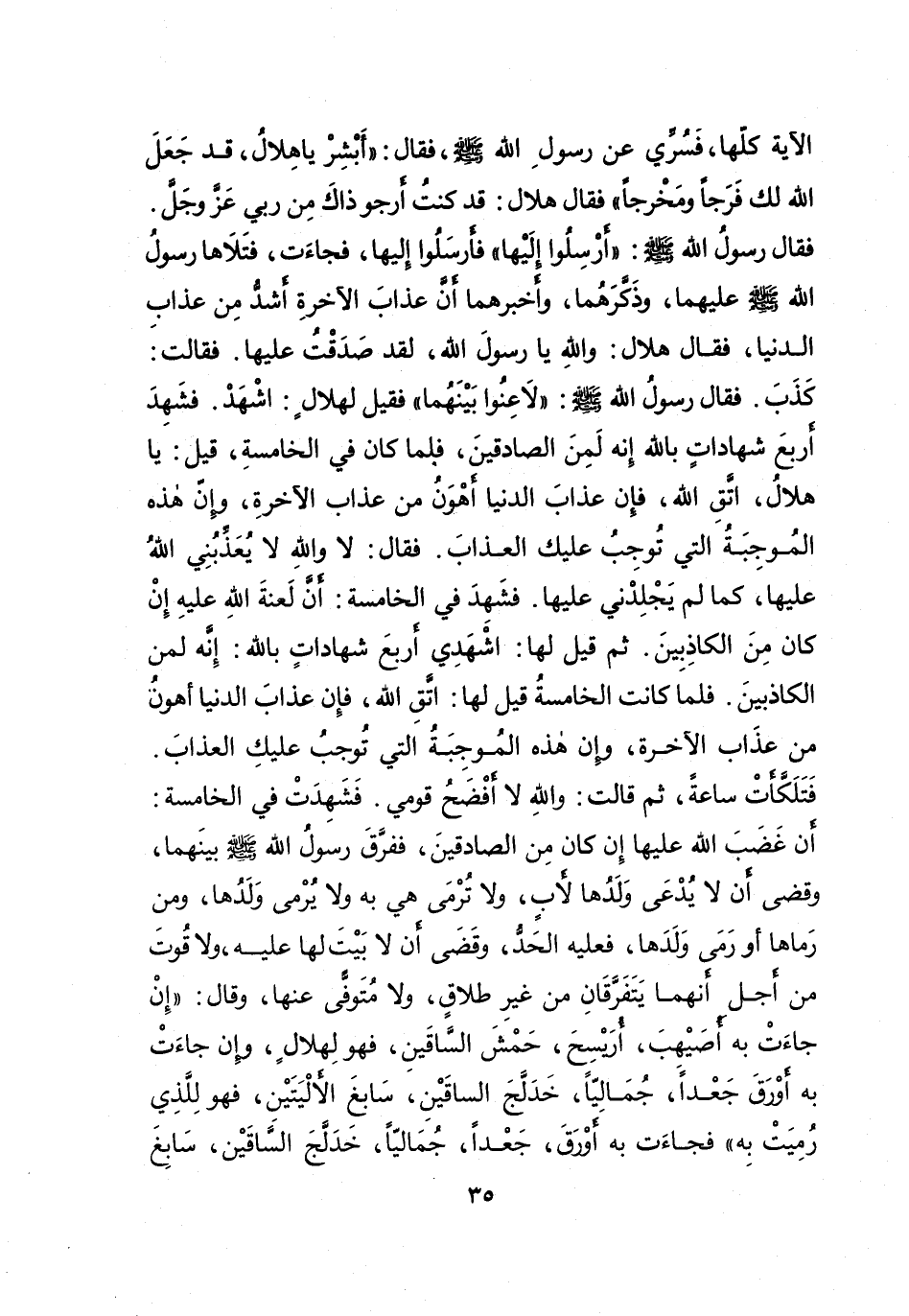 الْآيَةَ كُلَّها، فَسُرِّيَ عَنْ رَسُولِ اللهِ صَلَّى اللهُ عَلَيْهِ وَسَلَّمَ، فَقَالَ: " أَبْشِرْ يَا هِلَالُ، فَقَدْ جَعَلَ اللهُ لَكَ فَرَجًا وَمَخْرَجًا " فَقَالَ هِلَالٌ: قَدْ كُنْتُ أَرْجُو ذَاكَ مِنْ رَبِّي عَزَّ وَجَلَّ، فَقَالَ رَسُولُ اللهِ صَلَّى اللهُ عَلَيْهِ وَسَلَّمَ: " أَرْسِلُوا إِلَيْهَا " فَأَرْسَلُوا إِلَيْهَا، فَجَاءَتْ، فَتَلَاهَا رَسُولُ اللهِ صَلَّى اللهُ عَلَيْهِ وَسَلَّمَ عَلَيْهِمَا، وَذَكَّرَهُمَا، وَأَخْبَرَهُمَا أَنَّ عَذَابَ الْآخِرَةِ أَشَدُّ مِنْ عَذَابِ الدُّنْيَا، فَقَالَ هِلَالٌ: وَاللهِ يَا رَسُولَ اللهِ، لَقَدْ صَدَقْتُ عَلَيْهَا، فقالَتْ: كَذَبَ، فَقَالَ رَسُولُ اللهِ صَلَّى اللهُ عَلَيْهِ وَسَلَّمَ: " لَاعِنُوا بَيْنَهُمَا "، فَقِيلَ لِهِلَالٍ: اشْهَدْ، فَشَهِدَ أَرْبَعَ شَهَادَاتٍ بِاللهِ إِنَّهُ لَمِنَ الصَّادِقِينَ، فَلَمَّا كَانَ فِي الْخَامِسَةِ، قِيلَ: يَا هِلَالُ، اتَّقِ اللهَ، فَإِنَّ عَذَابَ الدُّنْيَا أَهْوَنُ مِنْ عَذَابِ الْآخِرَةِ، وَإِنَّ هَذِهِ الْمُوجِبَةُ الَّتِي تُوجِبُ عَلَيْكَ الْعَذَابَ فَقَالَ: لَا وَاللهِ لَا يُعَذِّبُنِي اللهُ عَلَيْهَا، كَمَا لَمْ يَجْلِدْنِي عَلَيْهَا، فَشَهِدَ فِي الْخَامِسَةِ: أَنَّ لَعْنَةَ اللهِ عَلَيْهِ إِنْ كَانَ مِنَ الكَاذِبِينَ، ثُمَّ قِيلَ لَهَا: اشْهَدِي أَرْبَعَ شَهَادَاتٍ بِاللهِ: إِنَّهُ لَمِنَ الكَاذِبِينَ فَلَمَّا كَانَتِ الْخَامِسَةُ قِيلَ لَهَا: اتَّقِ اللهَ فَإِنَّ عَذَابَ الدُّنْيَا أَهْوَنُ مِنْ عَذَابِ الْآخِرَةِ، وَإِنَّ هَذِهِ الْمُوجِبَةُ الَّتِي تُوجِبُ عَلَيْكِ الْعَذَابَ، فَتَلَكَّأَتْ سَاعَةً، ثُمَّ قَالَتْ: وَاللهِ لَا أَفْضَحُ قَوْمِي، فَشَهِدَتْ فِي الْخَامِسَةِ: أَنَّ غَضَبَ اللهِ عَلَيْهَا إِنْ كَانَ مِنَ الصَّادِقِينَ، فَفَرَّقَ رَسُولُ اللهِ صَلَّى اللهُ عَلَيْهِ وَسَلَّمَ بَيْنَهُمَا، وَقَضَى أَنْ لَا يُدْعَى وَلَدُهَا لِأَبٍ، وَلَا تُرْمَى هِيَ بِهِ وَلَا يُرْمَى وَلَدُهَا، وَمَنْ رَمَاهَا أَوْ رَمَى وَلَدَهَا، فَعَلَيْهِ الْحَدُّ، وَقَضَى أَنْ لَا بَيْتَ لَهَا عَلَيْهِ، وَلَا قُوتَ مِنْ أَجْلِ أَنَّهُمَا يَتَفَرَّقَانِ مِنْ غَيْرِ طَلَاقٍ، وَلَا مُتَوَفًّى عَنْهَا، وَقَالَ: " إِنْ جَاءَتْ بِهِ أُصَيْهِبَ، أُرَيْسِحَ، حَمْشَ السَّاقَيْنِ، فَهُوَ لِهِلَالٍ، وَإِنْ جَاءَتْ بِهِ أَوْرَقَ جَعْدًا، جُمَالِيًّا، خَدَلَّجَ السَّاقَيْنِ، سَابِغَ الْأَلْيَتَيْنِ، فَهُوَ لِلَّذِي رُمِيَتْ بِهِ " فَجَاءَتْ بِهِ أَوْرَقَ، جَعْدًا، جُمَالِيًّا، خَدَلَّجَ السَّاقَيْنِ، سَابِغَ