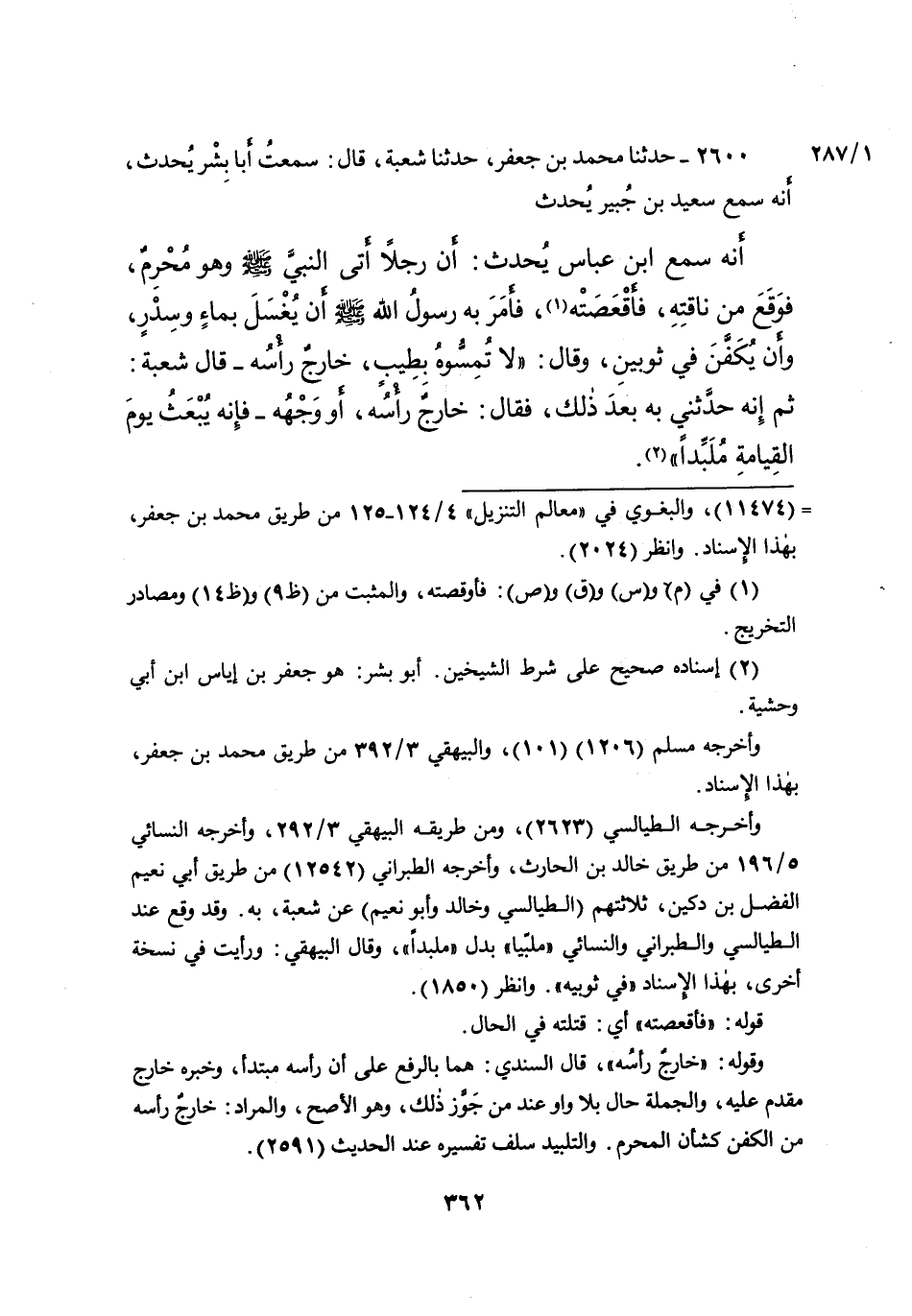 ٢٦٠٠ - حَدَّثَنَا مُحَمَّدُ بْنُ جَعْفَرٍ، حَدَّثَنَا شُعْبَةُ، قَالَ: سَمِعْتُ أَبَا بِشْرٍ، يُحَدِّثُ أَنَّهُ سَمِعَ سَعِيدَ بْنَ جُبَيْرٍ، يُحَدِّثُ أَنَّهُ سَمِعَ ابْنَ عَبَّاسٍ، يُحَدِّثُ أَنَّ رَجُلًا أَتَى النَّبِيَّ صَلَّى اللهُ عَلَيْهِ وَسَلَّمَ، وَهُوَ مُحْرِمٌ فَوَقَعَ مِنْ نَاقَتِهِ فَأَقْصَعَتْهُ، (١) فَأَمَرَ بِهِ رَسُولُ اللهِ صَلَّى اللهُ عَلَيْهِ وَسَلَّمَ، أَنْ يُغْسَلَ بِمَاءٍ وَسِدْرٍ وَأَنْ يُكَفَّنَ فِي ثَوْبَيْنِ وَقَالَ: " لَا تَمَسُّوهُ بِطِيبٍ خَارِجَ رَأْسِهِ، - قَالَ شُعْبَةُ: ثُمَّ إِنَّهُ حَدَّثَنِي بِهِ بَعْدَ ذَلِكَ، فَقَالَ: خَارِجَ رَأْسِهِ، أَوْ وَجْهِهِ - فَإِنَّهُ يُبْعَثُ يَوْمَ الْقِيَامَةِ مُلَبِّدًا " (٢)