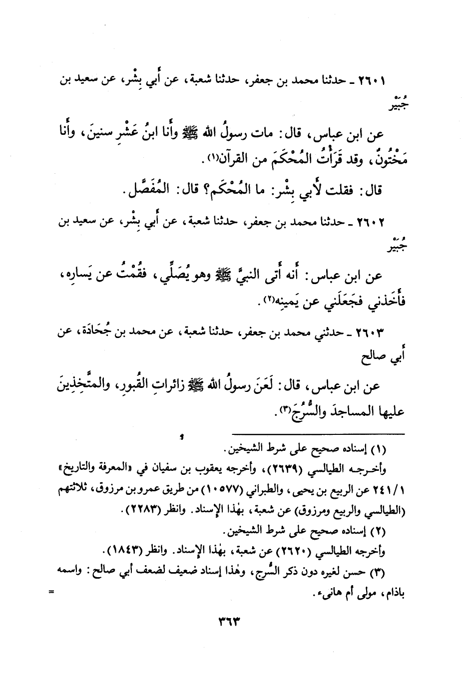 ٢٦٠٣ - حَدَّثَنِي مُحَمَّدُ بْنُ جَعْفَرٍ، حَدَّثَنَا شُعْبَةُ، عَنْ مُحَمَّدِ بْنِ جُحَادَةَ، عَنْ أَبِي صَالِحٍ، عَنِ ابْنِ عَبَّاسٍ، قَالَ: " لَعَنَ رَسُولُ اللهِ صَلَّى اللهُ عَلَيْهِ وَسَلَّمَ زَائِرَاتِ الْقُبُورِ، وَالْمُتَّخِذِينَ عَلَيْهَا الْمَسَاجِدَ وَالسُّرُجَ " (٣)
