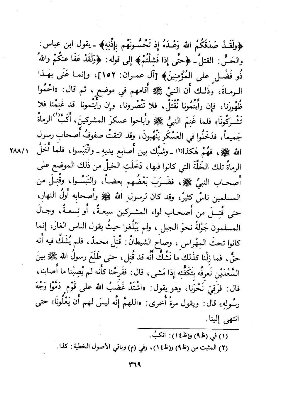 {وَلَقَدْ صَدَقَكُمِ اللهُ وَعْدَهُ إِذْ تَحُسُّونَهُمْ بِإِذْنِهِ} [آل عمران: ١٥٢]- يَقُولُ ابْنُ عَبَّاسٍ: وَالْحَسُّ: الْقَتْلُ - {حَتَّى إِذَا فَشِلْتُمْ} [آل عمران: ١٥٢]- إِلَى قَوْلِهِ - {وَلَقَدْ عَفَا عَنْكُمْ وَاللهُ ذُو فَضْلٍ عَلَى الْمُؤْمِنِينَ} [آل عمران: ١٥٢] ، وَإِنَّمَا عَنَى بِهَذَا الرُّمَاةَ، وَذَلِكَ أَنَّ النَّبِيَّ صَلَّى اللهُ عَلَيْهِ وَسَلَّمَ أَقَامَهُمْ فِي مَوْضِعٍ، ثُمَّ قَالَ: " احْمُوا ظُهُورَنَا، فَإِنْ رَأَيْتُمُونَا نُقْتَلُ، فَلا تَنْصُرُونَا، وَإِنْ رَأَيْتُمُونَا قَدْ غَنِمْنَا فَلا تُشْرِكُونَا " فَلَمَّا غَنِمَ النَّبِيُّ صَلَّى اللهُ عَلَيْهِ وَسَلَّمَ، وَأَبَاحُوا عَسْكَرَ الْمُشْرِكِينَ، أَكَبَّ (١) الرُّمَاةُ جَمِيعًا، فَدَخَلُوا فِي الْعَسْكَرِ يَنْهَبُونَ، وَقَدِ الْتَقَتْ صُفُوفُ أَصْحَابِ رَسُولِ اللهِ صَلَّى اللهُ عَلَيْهِ وَسَلَّمَ، فَهُمْ هَكَذَا (٢) - وَشَبَّكَ بَيْنَ أَصَابِعِ يَدَيْهِ - وَالْتَبَسُوا، فَلَمَّا أَخَلَّ الرُّمَاةُ تِلْكَ الْخَلَّةَ الَّتِي كَانُوا فِيهَا، دَخَلَتِ الْخَيْلُ مِنْ ذَلِكَ الْمَوْضِعِ عَلَى أَصْحَابِ النَّبِيِّ صَلَّى اللهُ عَلَيْهِ وَسَلَّمَ، فَضَرَبَ بَعْضُهُمْ بَعْضًا، وَالْتَبَسُوا، وَقُتِلَ مِنَ المُسْلِمِينَ نَاسٌ كَثِيرٌ، وَقَدْ كَانَ لِرَسُولِ اللهِ صَلَّى اللهُ عَلَيْهِ وَسَلَّمَ وَأَصْحَابِهِ أَوَّلُ النَّهَارِ، حَتَّى قُتِلَ مِنْ أَصْحَابِ لِوَاءِ الْمُشْرِكِينَ سَبْعَةٌ، أَوْ تِسْعَةٌ، وَجَالَ الْمُسْلِمُونَ جَوْلَةً نَحْوَ الْجَبَلِ، وَلَمْ يَبْلُغُوا حَيْثُ يَقُولُ النَّاسُ الْغَارَ، إِنَّمَا كَانُوا تَحْتَ الْمِهْرَاسِ، وَصَاحَ الشَّيْطَانُ: قُتِلَ مُحَمَّدٌ، فَلَمْ يُشَكَّ فِيهِ أَنَّهُ حَقٌّ، فَمَا زِلْنَا كَذَلِكَ مَا نَشُكُّ أَنَّهُ قَدْ قُتِلَ، حَتَّى طَلَعَ رَسُولُ اللهِ صَلَّى اللهُ عَلَيْهِ وَسَلَّمَ بَيْنَ السَّعْدَيْنِ نَعْرِفُهُ بِتَكَفُّئِهِ إِذَا مَشَى، قَالَ: فَفَرِحْنَا حَتَّى كَأَنَّهُ لَمْ يُصِبْنَا مَا أَصَابَنَا، قَالَ: فَرَقِيَ نَحْوَنَا، وَهُوَ يَقُولُ: " اشْتَدَّ غَضَبُ اللهِ عَلَى قَوْمٍ دَمَّوْا وَجْهَ رَسُولِهِ " قَالَ: وَيَقُولُ مَرَّةً أُخْرَى: " اللهُمَّ إِنَّهُ لَيْسَ لَهُمِ أنْ يَعْلُونَا " حَتَّى انْتَهَى إِلَيْنَا.
