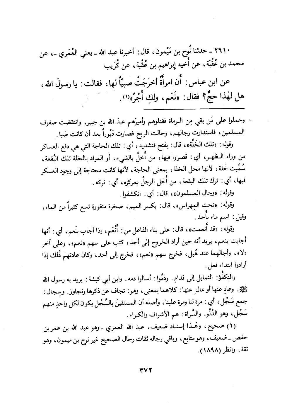 ٢٦١٠ - حَدَّثَنَا نُوحُ بْنُ مَيْمُونٍ، قَالَ: أَخْبَرَنَا عَبْدُ اللهِ يَعْنِي الْعُمَرِيَّ، عَنْ مُحَمَّدِ بْنِ عُقْبَةَ، عَنْ أَخِيهِ إِبْرَاهِيمَ بْنِ عُقْبَةَ، عَنْ كُرَيْبٍ، عَنِ ابْنِ عَبَّاسٍ، أَنَّ امْرَأَةً أَخْرَجَتْ صَبِيًّا لَهَا، فَقَالَتْ: يَا رَسُولَ اللهِ، هَلْ لِهَذَا حَجٌّ؟ فَقَالَ: " نَعَمْ، وَلَكِ أَجْرٌ " (١)