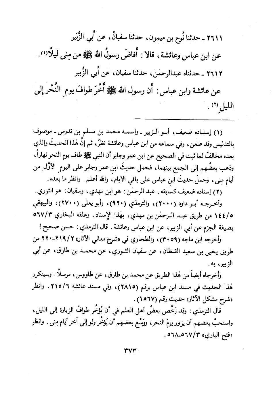 ٢٦١٢ - حَدَّثَنَاه عَبْدُ الرَّحْمَنِ، حَدَّثَنَا سُفْيَانُ، عَنْ أَبِي الزُّبَيْرِ، عَنْ عَائِشَةَ، وَابْنِ عَبَّاسٍ: " أَنَّ رَسُولَ اللهِ صَلَّى اللهُ عَلَيْهِ وَسَلَّمَ، أَخَّرَ طَوَافَ يَوْمِ النَّحْرِ إِلَى اللَّيْلِ " (٢)