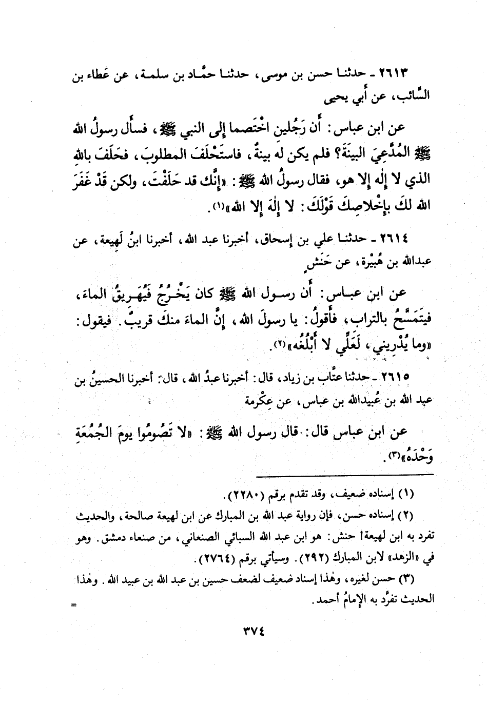 ٢٦١٥ - حَدَّثَنَا عَتَّابُ بْنُ زِيَادٍ، قَالَ: أَخْبَرَنَا عَبْدُ اللهِ، قَالَ: أَخْبَرَنَا الْحُسَيْنُ بْنُ عَبْدِ اللهِ بْنِ عُبَيْدِ اللهِ بْنِ عَبَّاسٍ، عَنْ عِكْرِمَةَ، عَنِ ابْنِ عَبَّاسٍ، قَالَ: قَالَ رَسُولُ اللهِ صَلَّى اللهُ عَلَيْهِ وَسَلَّمَ: " لَا تَصُومُوا يَوْمَ الْجُمُعَةِ وَحْدَهُ " (٣)