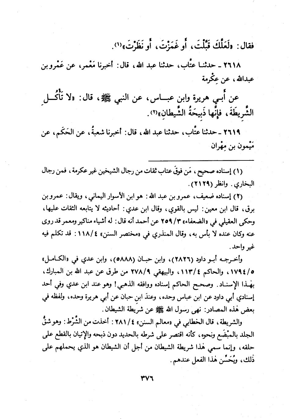 ٢٦١٨ - حَدَّثَنَا عَتَّابٌ، حَدَّثَنَا عَبْدُ اللهِ، قَالَ: أَخْبَرَنَا مَعْمَرٌ، عَنْ عَمْرِو بْنِ عَبْدِ اللهِ، عَنْ عِكْرِمَةَ، عَنْ أَبِي هُرَيْرَةَ، وَابْنِ عَبَّاسٍ، عَنِ النَّبِيِّ صَلَّى اللهُ عَلَيْهِ وَسَلَّمَ قَالَ: " لَا تَأْكُلِ الشَّرِيطَةَ، فَإِنَّهَا ذَبِيحَةُ الشَّيْطَانِ " (٢)