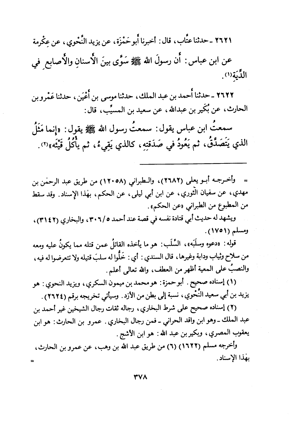٢٦٢١ - حَدَّثَنَا عَتَّابٌ، قَالَ: أَخْبَرَنَا أَبُو حَمْزَةَ، عَنْ يَزِيدَ النَّحْوِيِّ، عَنْ عِكْرِمَةَ، عَنِ ابْنِ عَبَّاسٍ، أَنَّ رَسُولَ اللهِ صَلَّى اللهُ عَلَيْهِ وَسَلَّمَ " سَوَّى بَيْنَ الْأَسْنَانِ وَالْأَصَابِعِ فِي الدِّيَةِ " (١)