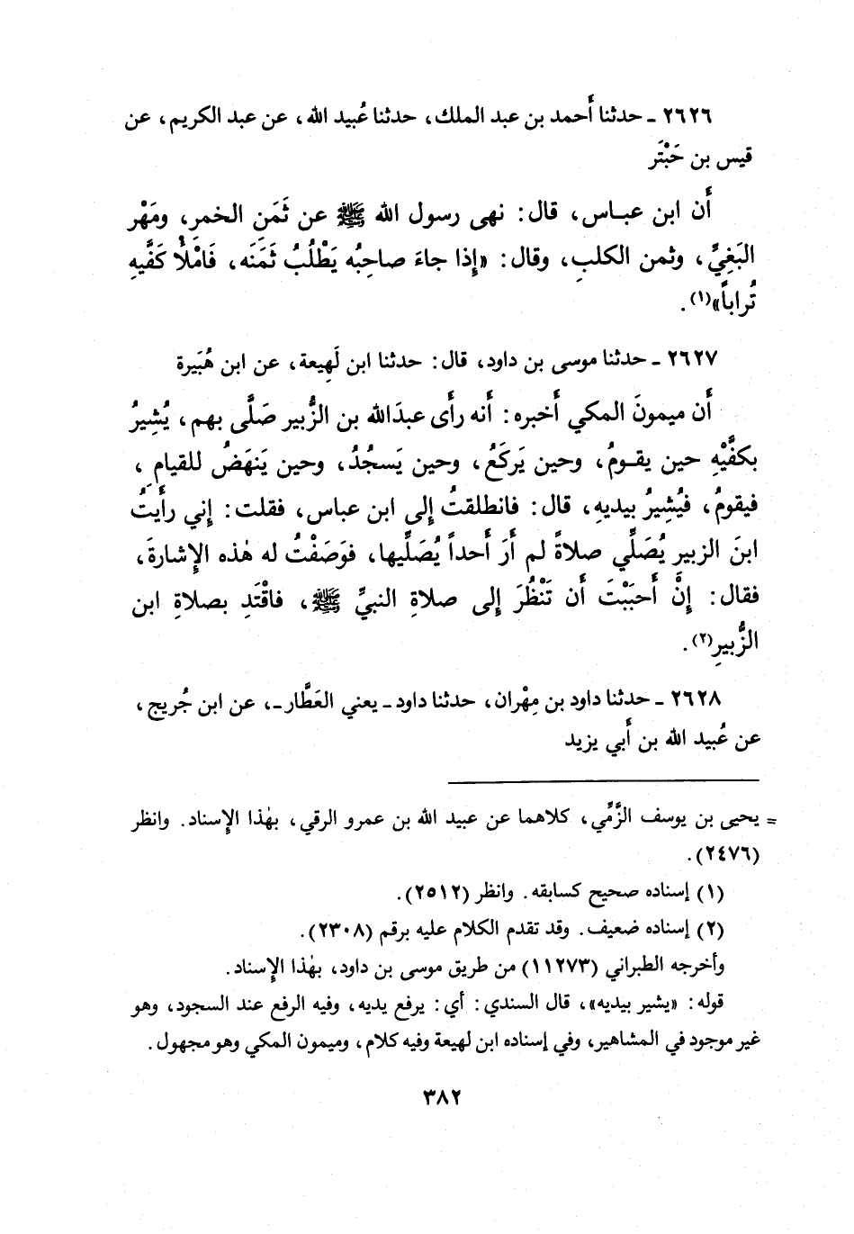٢٦٢٧ - حَدَّثَنَا مُوسَى بْنُ دَاوُدَ، قَالَ: حَدَّثَنَا ابْنُ لَهِيعَةَ، عَنِ ابْنِ هُبَيْرَةَ، أَنَّ مَيْمُونًا الْمَكِّيَّ، أَخْبَرَهُ: أَنَّهُ رَأَى عَبْدَ اللهِ بْنَ الزُّبَيْرِ صَلَّى بِهِمْ، يُشِيرُ بِكَفَّيْهِ حِينَ يَقُومُ، وَحِينَ يَرْكَعُ، وَحِينَ يَسْجُدُ، وَحِينَ يَنْهَضُ لِلقِيَامِ، فَيَقُومُ، فَيُشِيرُ بِيَدَيْهِ، قَالَ: فَانْطَلَقْتُ إِلَى ابْنِ عَبَّاسٍ، فَقُلْتُ: إِنِّي رَأَيْتُ ابْنَ الزُّبَيْرِ يُصَلِّي صَلاةً لَمْ أَرَ أَحَدًا يُصَلِّيهَا، فَوَصَفْتُ لَهُ هَذِهِ الْإِشَارَةَ، فَقَالَ: " إِنْ أَحْبَبْتَ أَنْ تَنْظُرَ إِلَى صَلَاةِ النَّبِيِّ صَلَّى اللهُ عَلَيْهِ وَسَلَّمَ، فَاقْتَدِ بِصَلَاةِ ابْنِ الزُّبَيْرِ " (٢)