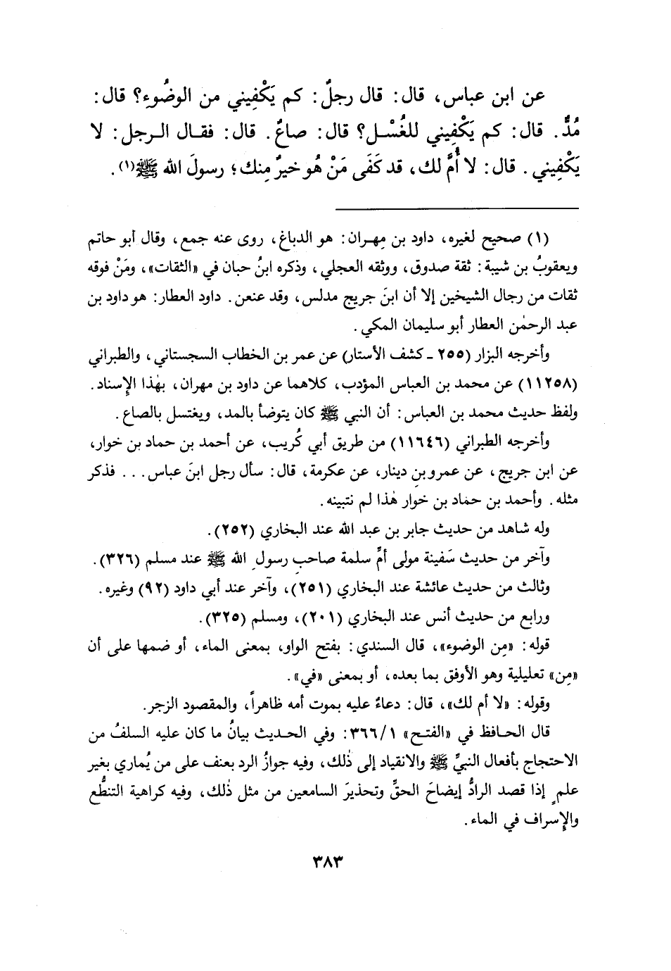 عَنِ ابْنِ عَبَّاسٍ، قَالَ: قَالَ رَجُلٌ: كَمْ يَكْفِينِي مِنَ الوُضُوءِ؟ قَالَ: مُدٌّ. قَالَ: كَمْ يَكْفِينِي لِلغُسْلِ؟ قَالَ: صَاعٌ، قَالَ: فَقَالَ الرَّجُلُ: لَا يَكْفِينِي. قَالَ: لَا أُمَّ لَكَ " قَدْ كَفَى مَنْ هُوَ خَيْرٌ مِنْكَ، رَسُولَ اللهِ صَلَّى اللهُ عَلَيْهِ وَسَلَّمَ " (١)