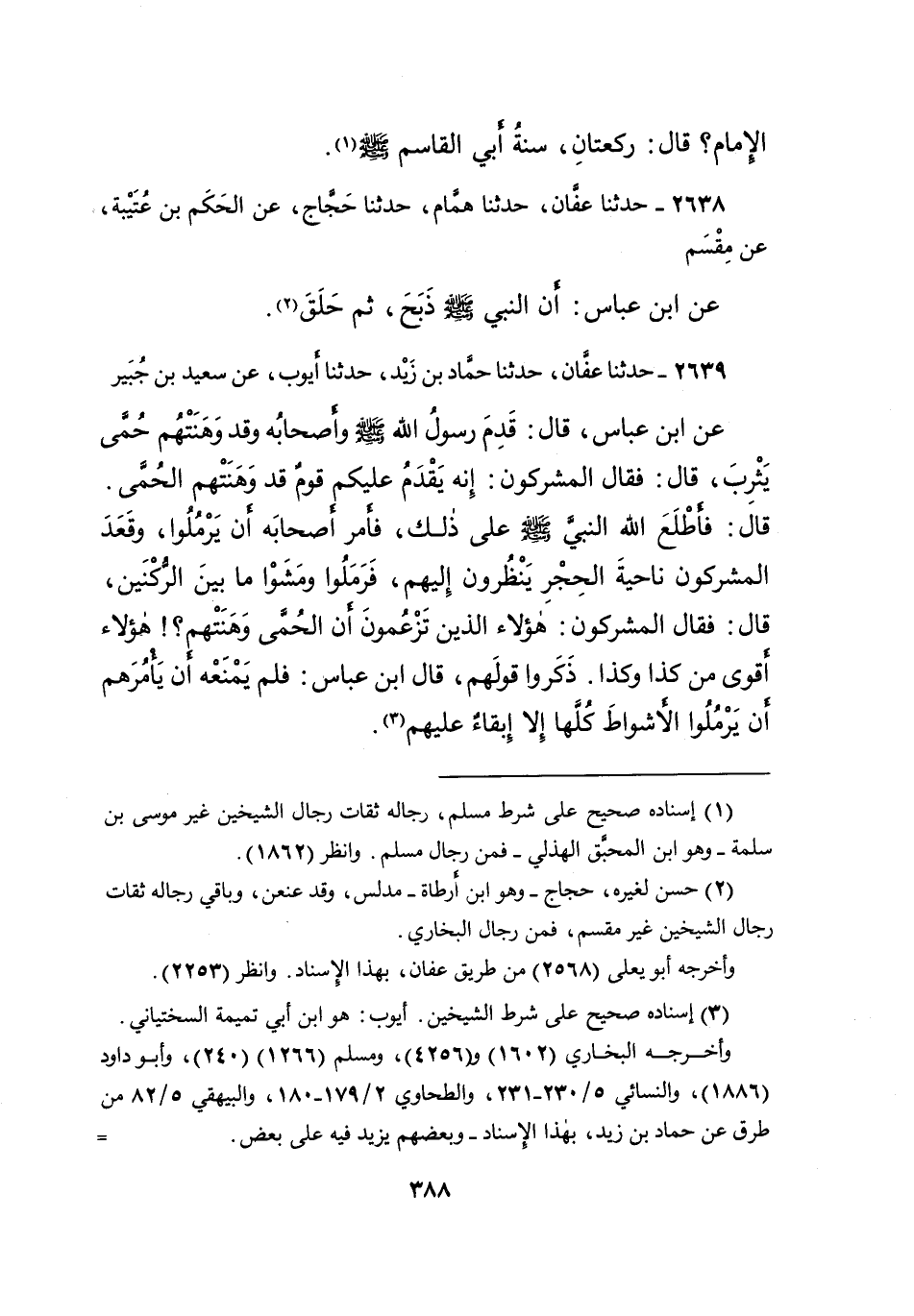 ٢٦٣٩ - حَدَّثَنَا عَفَّانُ، حَدَّثَنَا حَمَّادُ بْنُ زَيْدٍ، حَدَّثَنَا أَيُّوبُ، عَنْ سَعِيدِ بْنِ جُبَيْرٍ، عَنِ ابْنِ عَبَّاسٍ، قَالَ: قَدِمَ رَسُولُ اللهِ صَلَّى اللهُ عَلَيْهِ وَسَلَّمَ وَأَصْحَابُهُ وَقَدْ وَهَنَتْهُمْ حُمَّى يَثْرِبَ، قَالَ: فَقَالَ الْمُشْرِكُونَ: إِنَّهُ يَقْدَمُ عَلَيْكُمْ قَوْمٌ قَدْ وَهَنَتْهُمْ الْحُمَّى. قَالَ: " فَأَطْلَعَ اللهُ النَّبِيَّ صَلَّى اللهُ عَلَيْهِ وَسَلَّمَ عَلَى ذَلِكَ فَأَمَرَ أَصْحَابَهُ أَنْ يَرْمُلُوا، وَقَعَدَ الْمُشْرِكُونَ نَاحِيَةَ الْحِجْرِ يَنْظُرُونَ إِلَيْهِمْ، فَرَمَلُوا وَمَشَوْا مَا بَيْنَ الرُّكْنَيْنِ، قَالَ: فَقَالَ الْمُشْرِكُونَ: هَؤُلاءِ الَّذِينَ تَزْعُمُونَ أَنَّ الْحُمَّى وَهَنَتْهُمْ؟ هَؤُلاءِ أَقْوَى مِنْ كَذَا وَكَذَا. ذَكَرُوا قَوْلَهُمْ، قَالَ ابْنُ عَبَّاسٍ: " فَلَمْ يَمْنَعْهُ أَنْ يَأْمُرَهُمْ أَنْ يَرْمُلُوا الْأَشْوَاطَ كُلَّهَا إِلا إِبْقَاءٌ عَلَيْهِمْ " (٣)