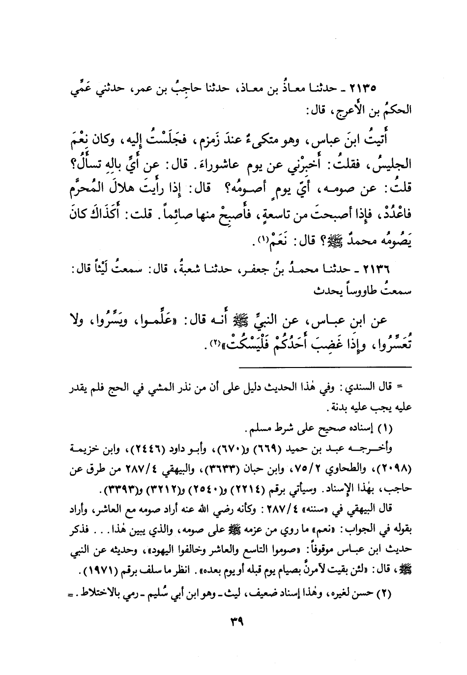 ٢١٣٥ - حَدَّثَنَا مُعَاذُ بْنُ مُعَاذٍ، حَدَّثَنَا حَاجِبُ بْنُ عُمَرَ، حَدَّثَنِي عَمِّي الْحَكَمُ بْنُ الْأَعْرَجِ، قَالَ: أَتَيْتُ ابْنَ عَبَّاسٍ، وَهُوَ مُتَّكِئٌ عِنْدَ زَمْزَمَ، فَجَلَسْتُ إِلَيْهِ، وَكَانَ نِعْمَ الْجَلِيسُ، فَقُلْتُ: أَخْبِرْنِي عَنْ يَوْمِ عَاشُورَاءَ. قَالَ: عَنْ أَيِّ بَالِهِ تَسْأَلُ؟ قُلْتُ: عَنْ صَوْمِهِ، أَيُّ يَوْمٍ أَصُومُهُ؟ قَالَ: " إِذَا رَأَيْتَ هِلالَ الْمُحَرَّمِ فَاعْدُدْ، فَإِذَا أَصْبَحْتَ مِنْ تَاسِعَةٍ، فَأَصْبِحْ مِنْهَا صَائِمًا " قُلْتُ: أَكَذَاكَ " كَانَ يَصُومُهُ مُحَمَّدٌ صَلَّى اللهُ عَلَيْهِ وَسَلَّمَ "؟، قَالَ: نَعَمْ (١)