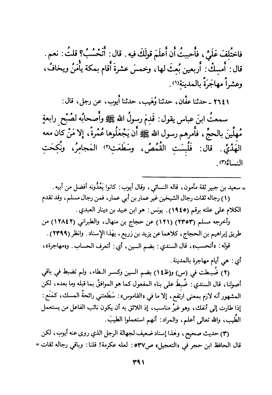 ٢٦٤١ - حَدَّثَنَا عَفَّانُ، حَدَّثَنَا وُهَيْبٌ، حَدَّثَنَا أَيُّوبُ، عَنْ رَجُلٍ، قَالَ: سَمِعْتُ ابْنَ عَبَّاسٍ، يَقُولُ: قَدِمَ رَسُولُ اللهِ صَلَّى اللهُ عَلَيْهِ وَسَلَّمَ، وَأَصْحَابُهُ لِصُبْحِ رَابِعَةٍ مُهِلِّينَ بِالْحَجِّ " فَأَمَرَهُمْ رَسُولُ اللهِ صَلَّى اللهُ عَلَيْهِ وَسَلَّمَ أَنْ يَجْعَلُوهَا عُمْرَةً، إِلا مَنْ كَانَ مَعَهُ الْهَدْيُ " قَالَ: " فَلُبِسَتِ الْقُمُصُ، وَسَطَعَتْ (٢) الْمَجَامِرُ، وَنُكِحَتِ النِّسَاءُ " (٣)