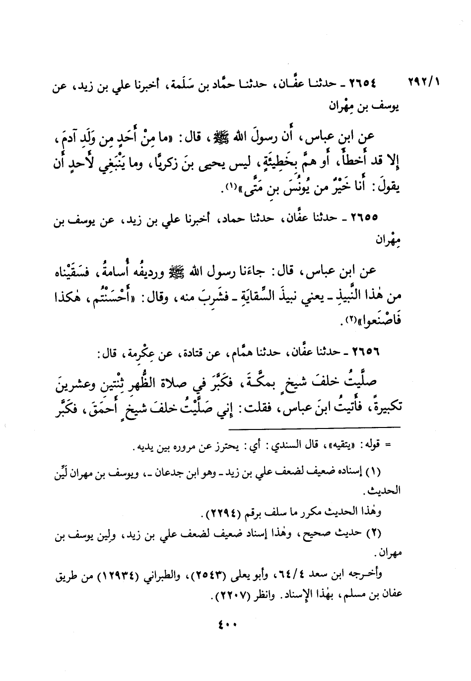 ٢٦٥٤ - حَدَّثَنَا عَفَّانُ، حَدَّثَنَا حَمَّادُ بْنُ سَلَمَةَ، أَخْبَرَنَا عَلِيُّ بْنُ زَيْدٍ، عَنْ يُوسُفَ بْنِ مِهْرَانَ، عَنِ ابْنِ عَبَّاسٍ، أَنَّ رَسُولَ اللهِ صَلَّى اللهُ عَلَيْهِ وَسَلَّمَ قَالَ: " مَا مِنْ أَحَدٍ مِنْ وَلَدِ آدَمَ، إِلا قَدْ أَخْطَأَ، أَوْ هَمَّ بِخَطِيئَةٍ، لَيْسَ يَحْيَى بْنُ زَكَرِيَّا، وَمَا يَنْبَغِي لِأَحَدٍ أَنْ يَقُولَ: أَنَا خَيْرٌ مِنْ يُونُسَ بْنِ مَتَّى " (١)